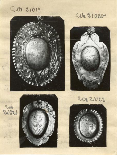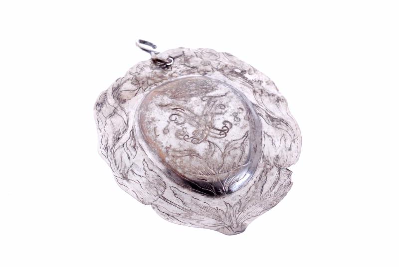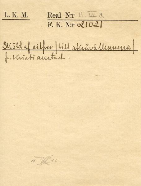 Har sannolikt hängt på en skråpokal, dit den skänktes 1686, enligt det graverade årtalet; mitt på, ett monogram som innehåller givarens initialer. Från Kristianstad. Uppköpt den 23 september 1910.