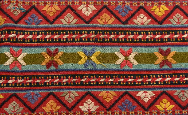 Rosengång och inplock på ripsbotten. Tvärrandig, 5 smalare och bredare partier avgränsade av svarta bårder. Partierna randade i flera röda, varma, nyanser. Två av dem har mittbård av brungrönt och blågrönt. Rikt mönstrat med inplock i form av stjärnor, ruto, vinkelbårder. Rosengångsränder.