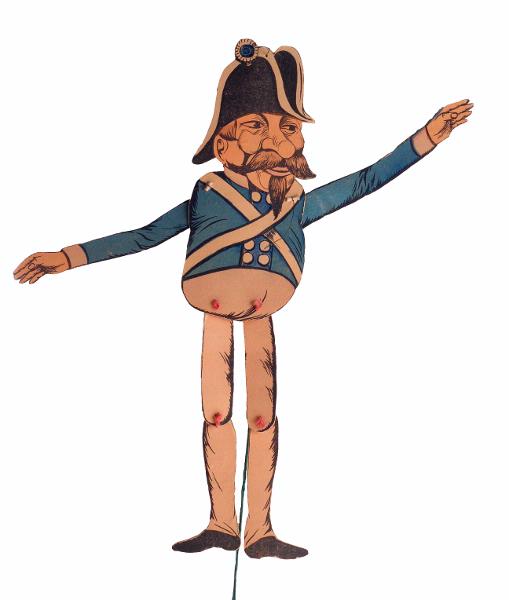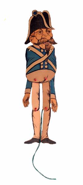 Sprattelgubbe, koppartryck på papper, limmat på papp, handkolorerat, föreställer soldat med napoleonhatt