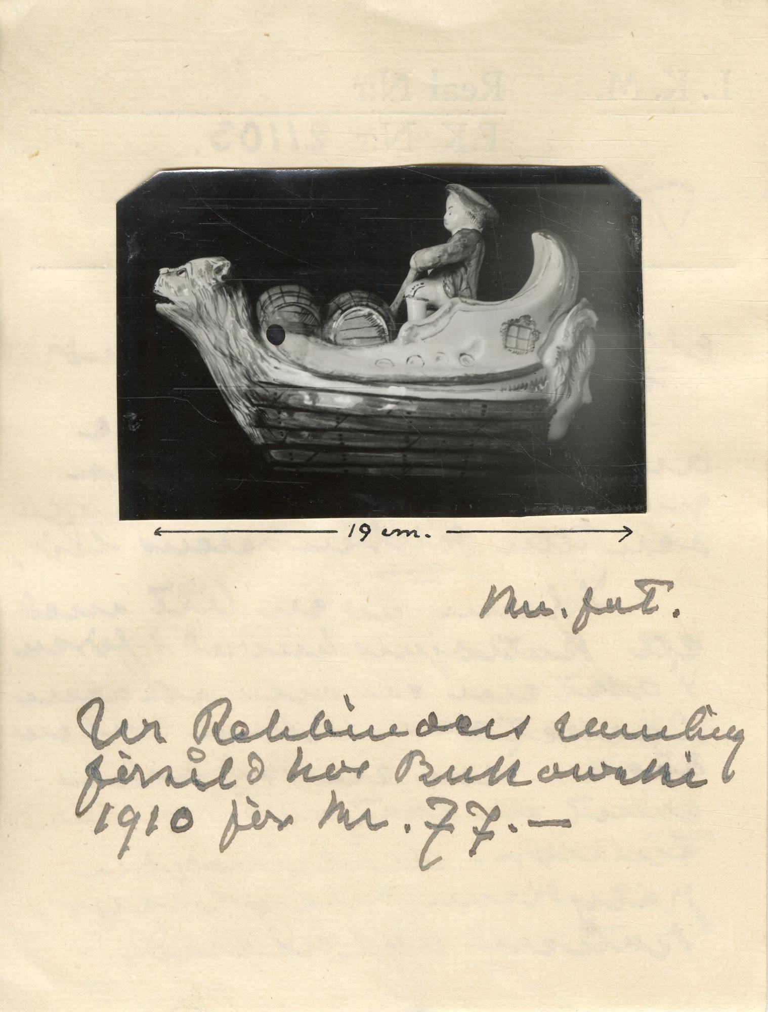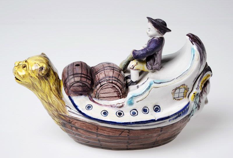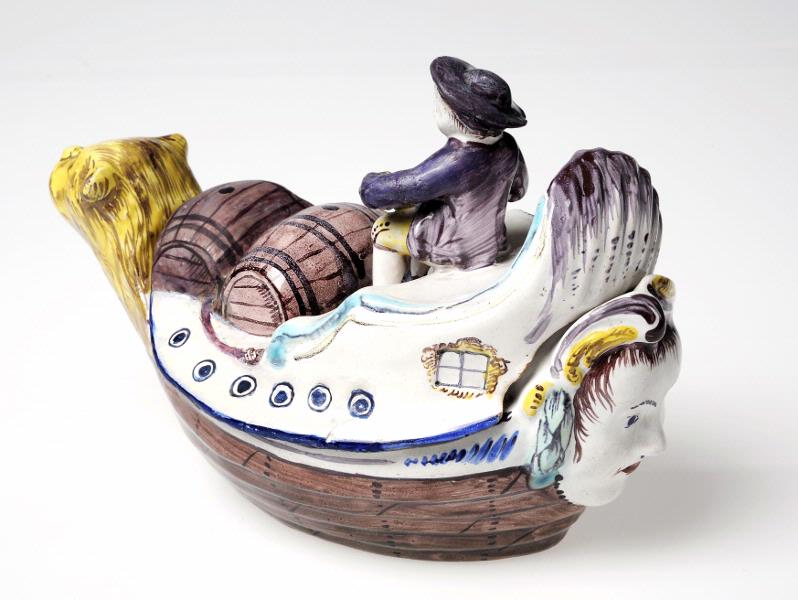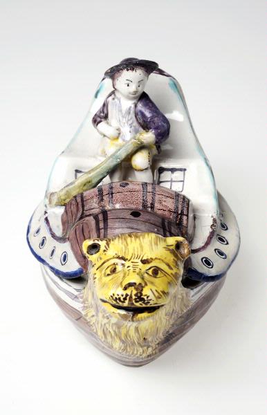 - Ask i form av en båt med roddare. I fören av båten ett tigerhuvud, i aktern ett människoansikte. Locket utgörs av ett däck, med två tunnor. På det upphöjda akterdäcket sitter roddaren med åra i handen. Roddaren är klädd i gula knäbyxor, mangan väst, rock och hatt.