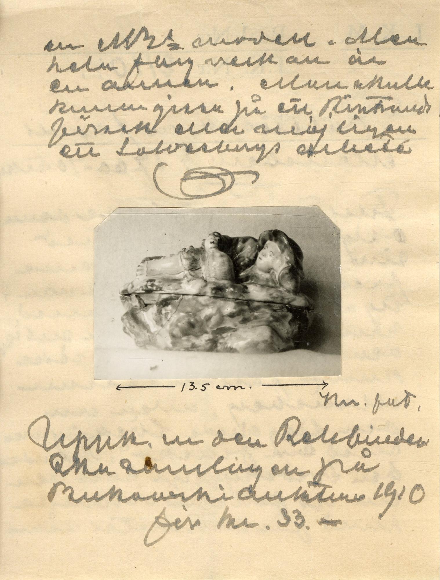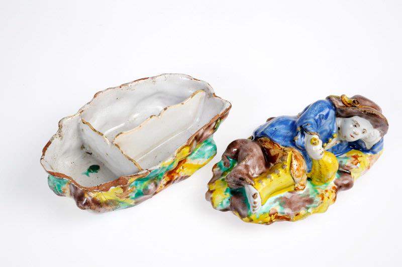 - I form av en liggande herde på locket. Han har ljusblå rock, gula byxor och brunmangan hatt med gult band. I handen håller han en gul flaska. Marken är målad i kraftigt gult, grönt och brunt. Underdelen indelad i tre fack. Röd lera.