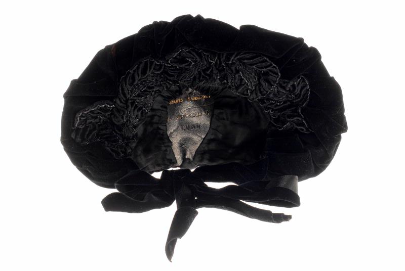 Svart, med draperad silkessammet och silkes- och pärldekorationer. Modellen är en nackhatt med långa hakband av sammet och har haft ytterliggare dekorationer. Hatten har en stomme av etamin med karkas som styvnad. Foderhuvan är av silke och i nacken sitter en präglad läderetikett med texten "Mattssons Modeaffär Klostergatan 7, Lund".