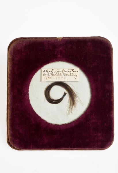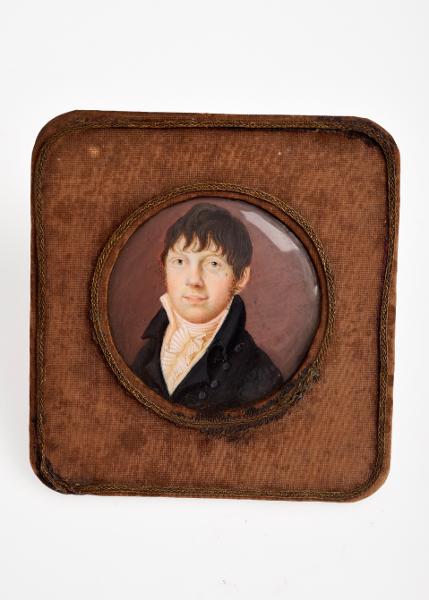 Miniatyrporträtt, Akademiräntmästare Carl Fredrik Berling (1785-1847), bröstbild; runt; monterad inom glas i tygklädd ram; på baksidan lila sammet och hårlock