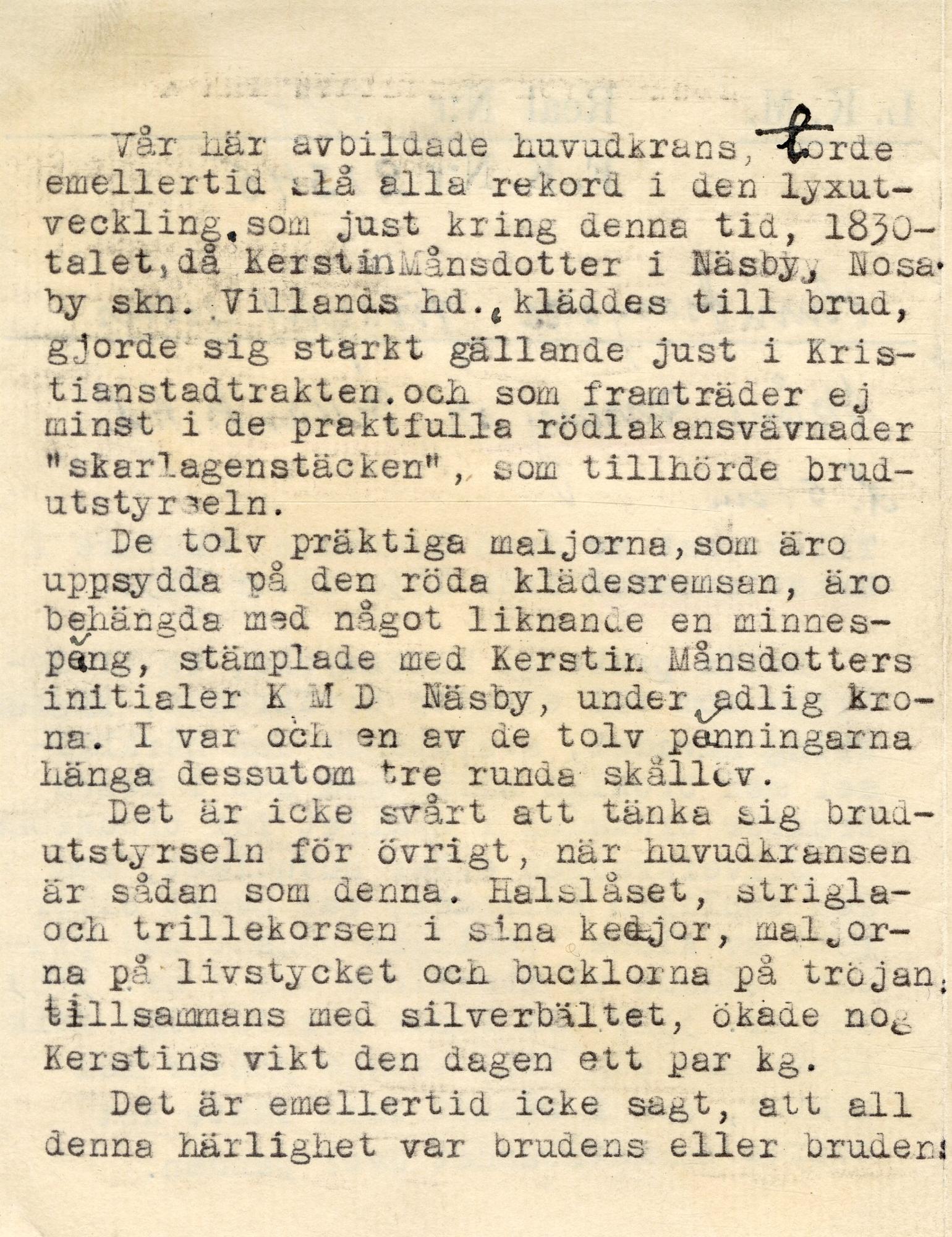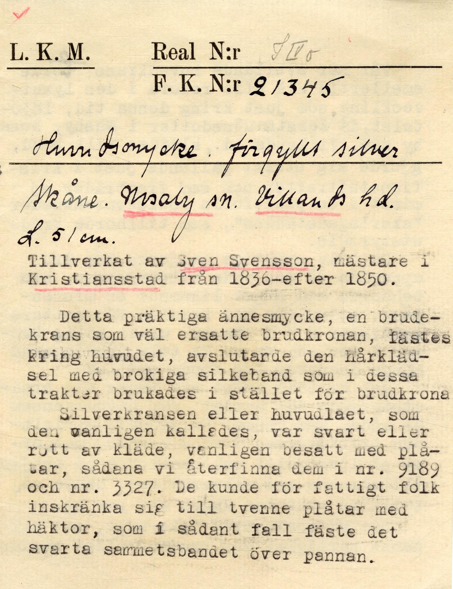 - Tolv maljor med beslag monterade på rött kläde. I varje malja händer en myntliknande rund silverplatta med tre runda skålade löv i varje rund platta. På plattorna en krona och därunder: KMD NÄSY - ägarinnans initialer och hemort. Silvret förgyllt.