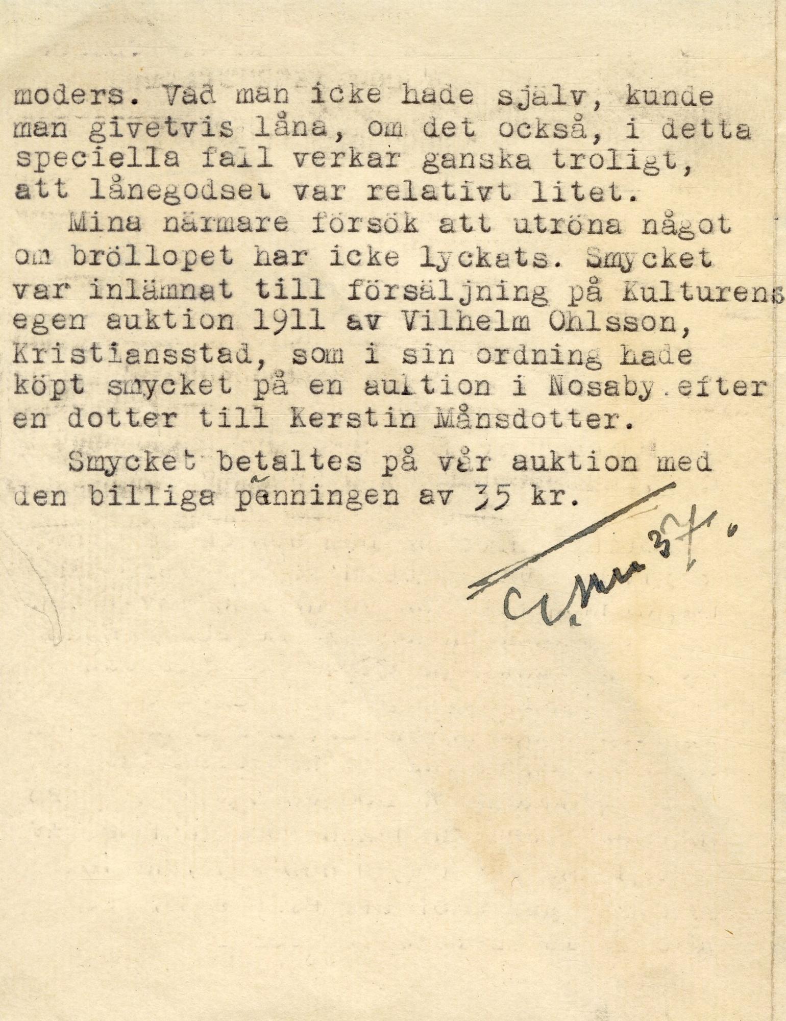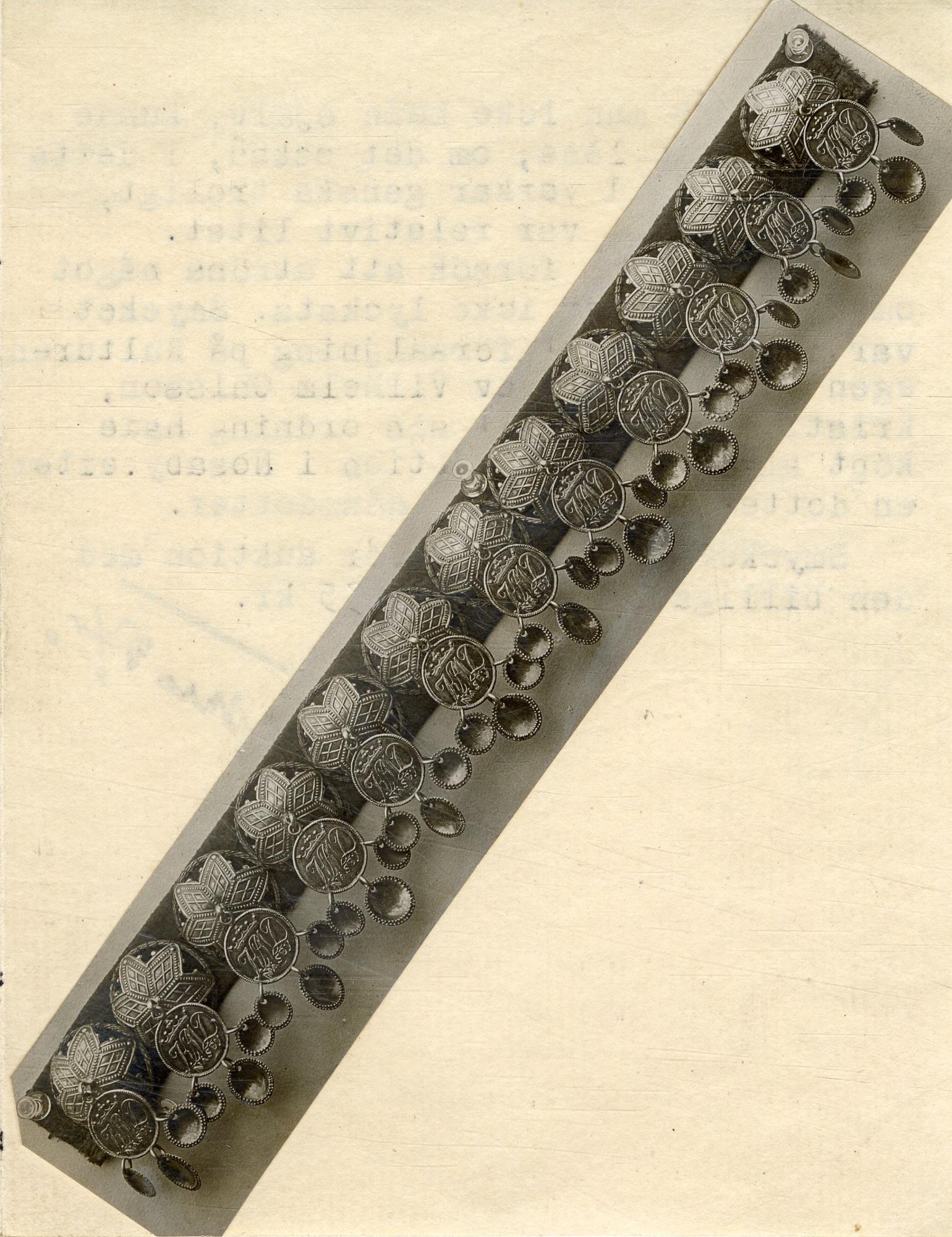 - "Huvudhlad". Silvermaljor med runda hängen 12 st maljor, monterat mot brudhättan.