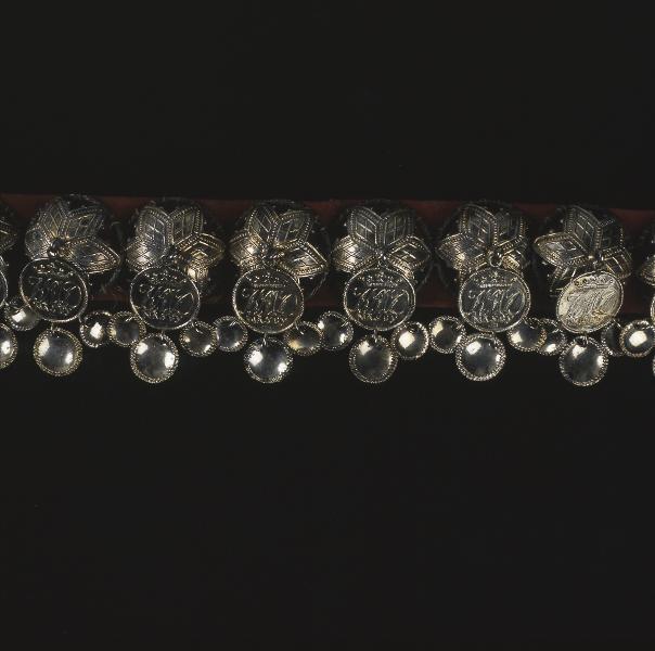 "Huvudhlad". Silvermaljor med runda hängen 12 st maljor, monterat mot brudhättan.