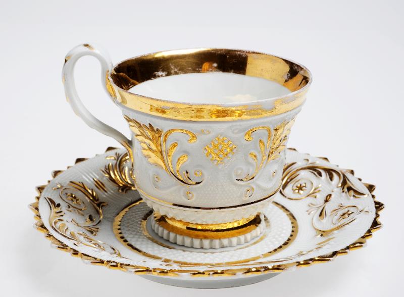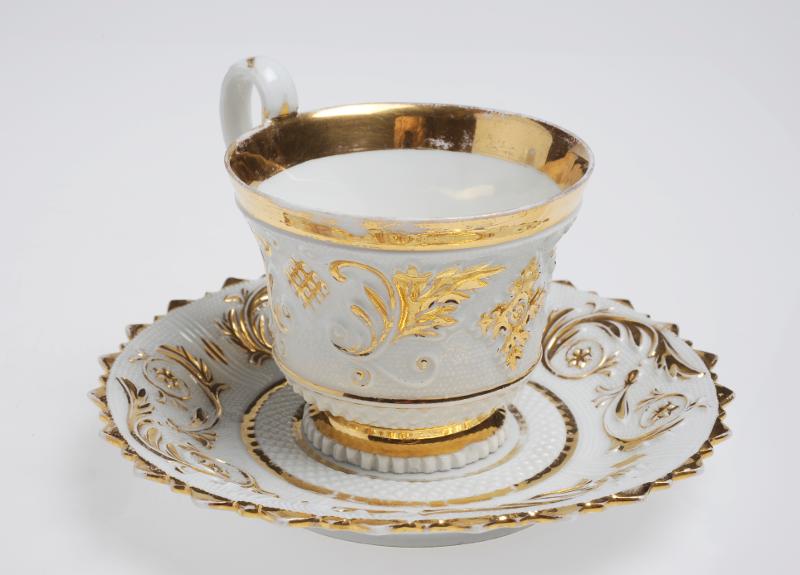 Med fat. Kopp på låg fot, fatet med uddkant. Reliefdekor, gåshud, med blomornament mot fond av punkter i relief. Kraftig förgyllning vid mynning och upphöjda ornament.