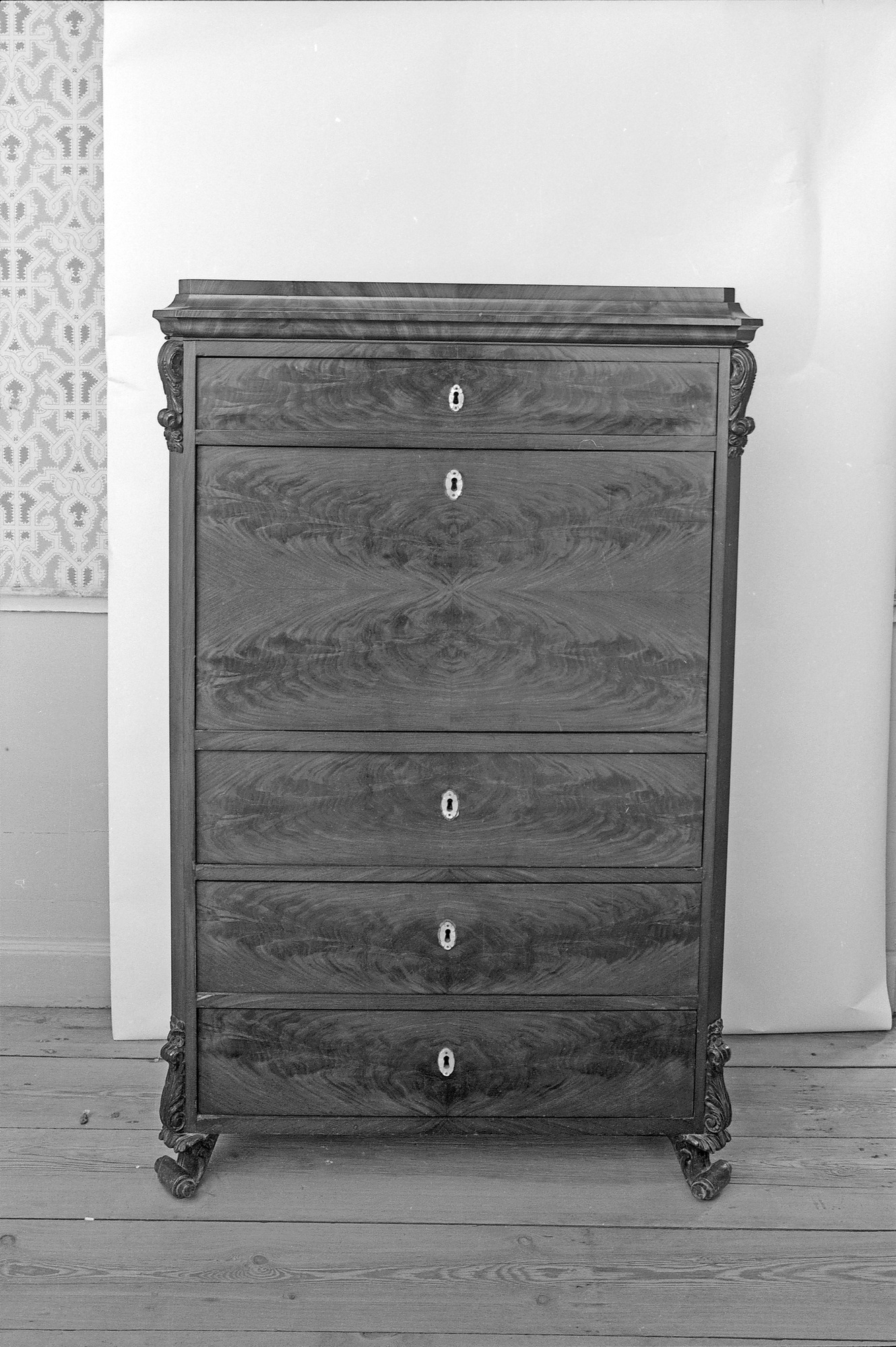 KM 36301. Klaffbyrå, polerad mahogny, skurna ornament, mahogny 1840 ca, Thomanderska samlingen.