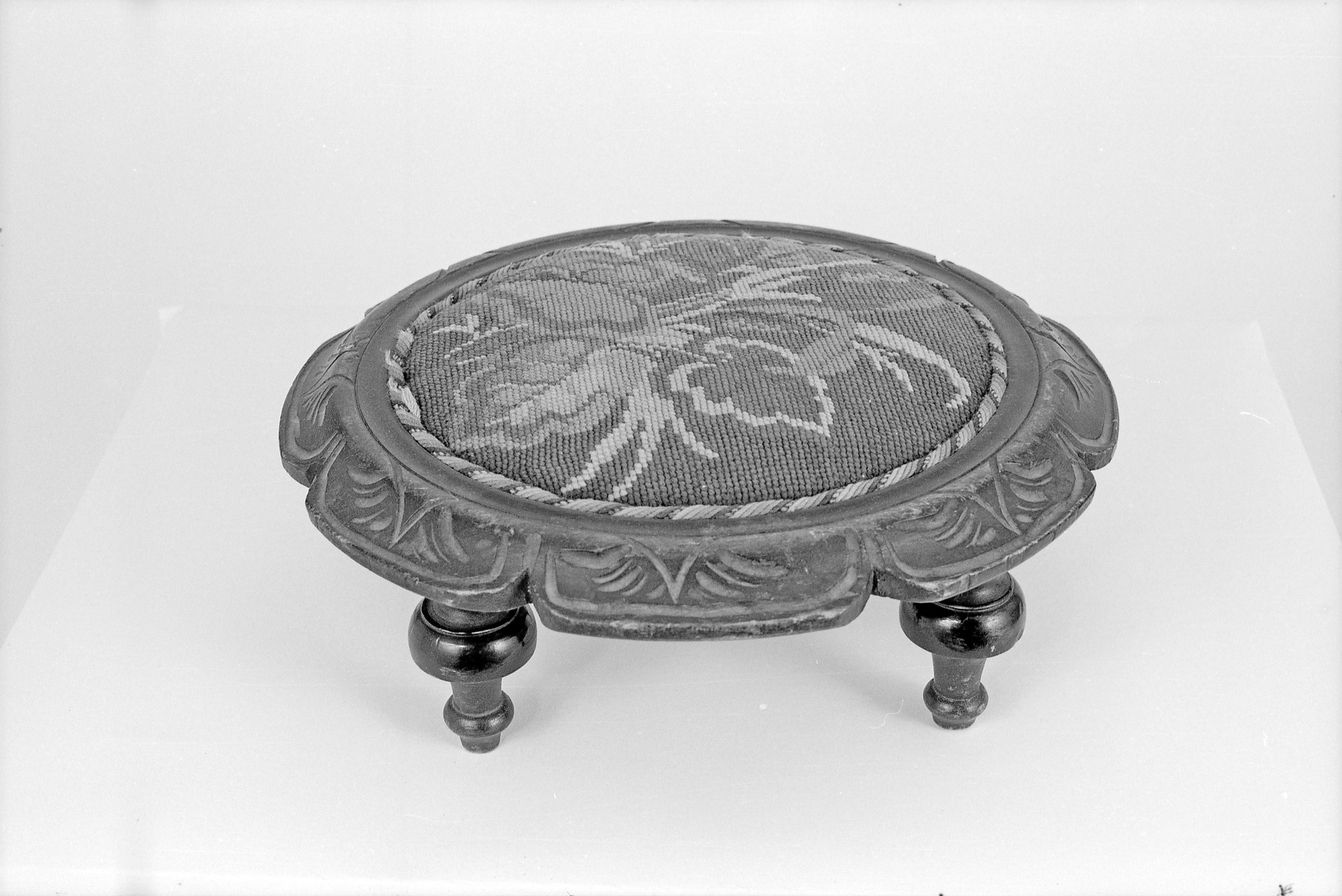 KM 36285. Pall, björk, smidad, svartmålad, korsstyngbroderi, Thomanderska samlingen.