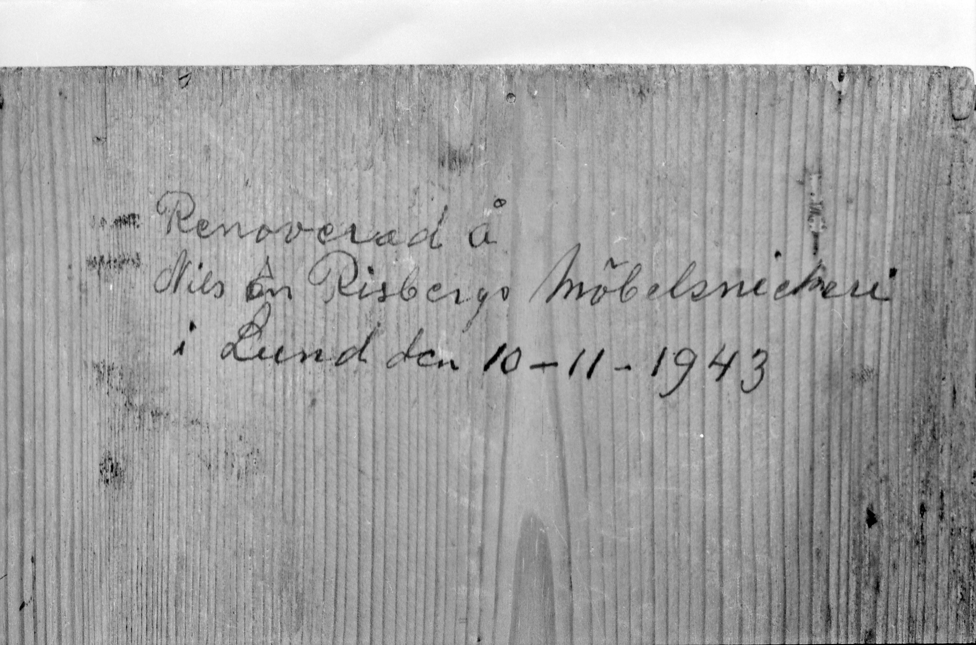 KM 10202(?). Inskription "Renoverad å Nils Risbergs Möbelsnickeri i Lund, den 10-11-1943 ".