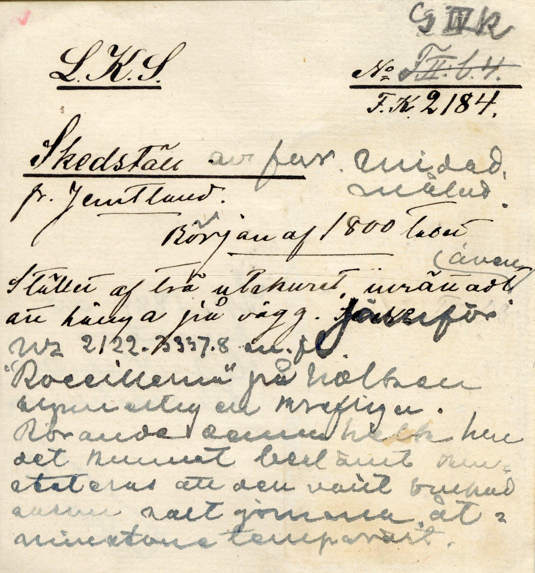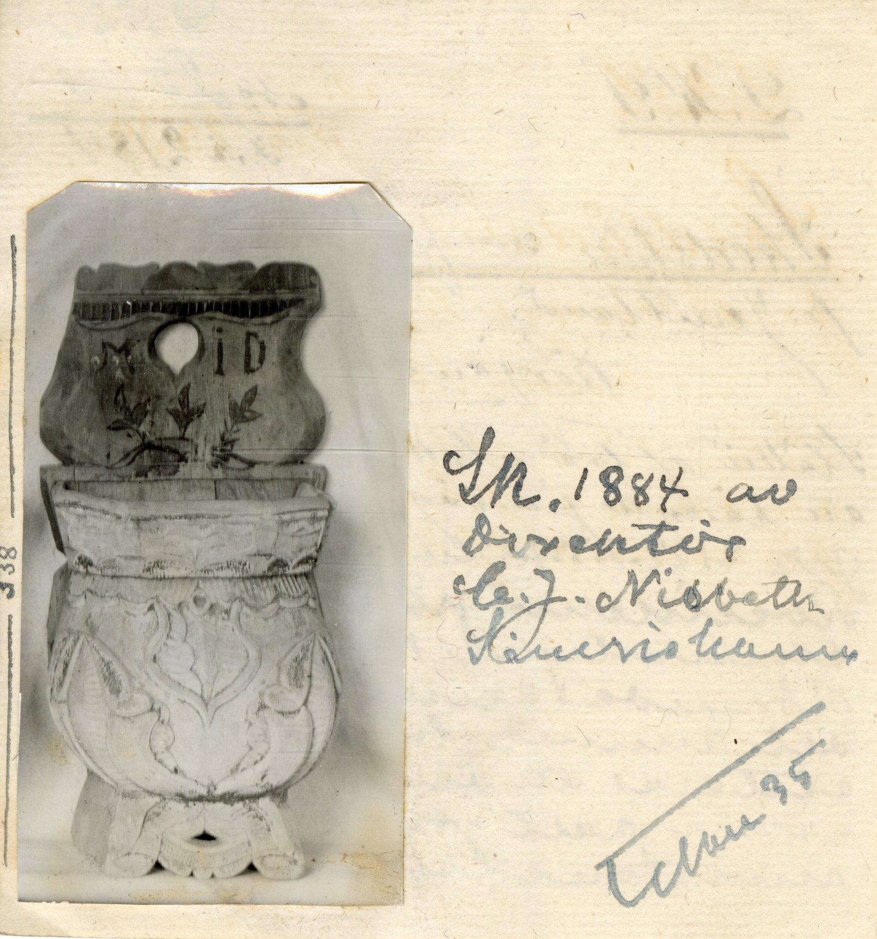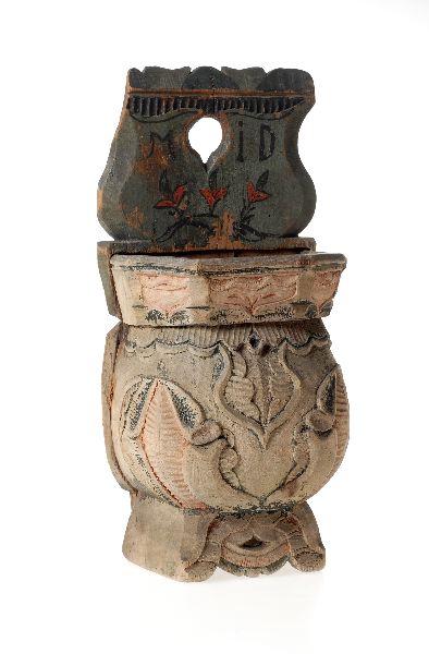 Locket liknar en vapensköld, stället väldigt svulstigt. Locket är mörgrönblå målad (vilket hela skedstället har varit, troligen). Med röda blommor.