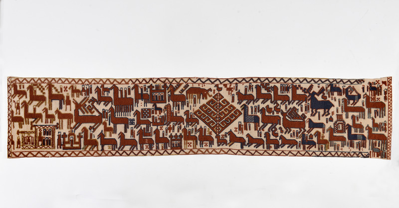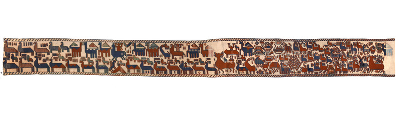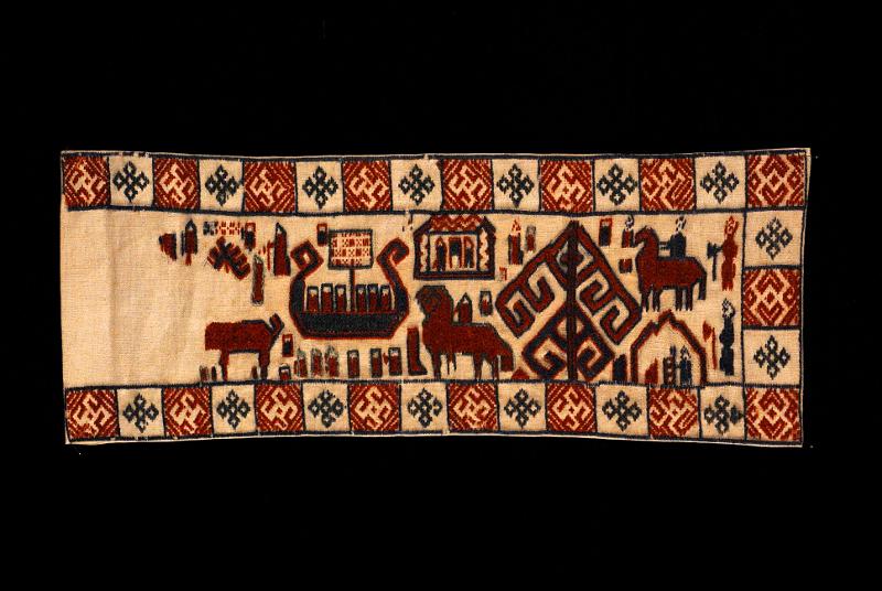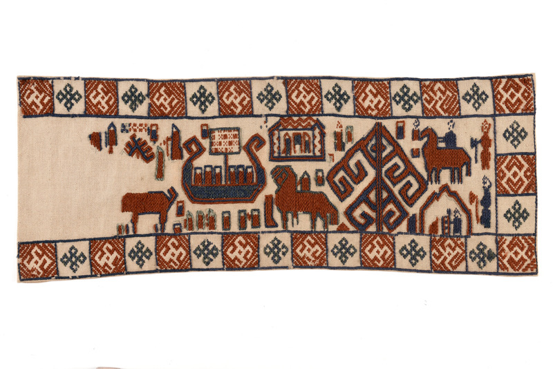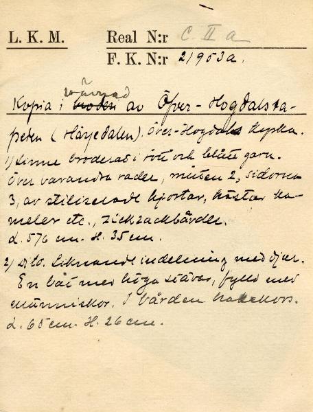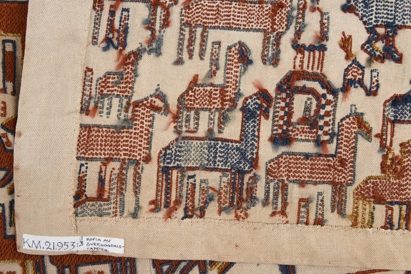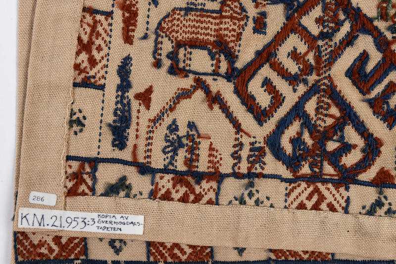 Kopia, utförd på KSAL 1911-1912.; "Hösten 1910 inbjöds Karlin av Jämtslöjd att komma till Östersund och hålla föredrag om hemslöjdens återupplivande och för att ge råd och anvisningar för förvaringen av Jämtslöjds insamlade föremål. I Östersund fick han se en "altarduk" som samma år påträffats i en kyrkbod i Överhogdal i nordvästra Härjedalen. Trots dess defekta tillstånd såg Karlin med en gång fyndets värde och lovade att medverka som sakkunnig vid en utställning av kyrkokonst som skulle hållas i Östersund sommaren 1911. I katalogen kallade Karlin altarduken för Överhogdalstapeten, därför att den kunde betraktas som ett nordiskt motstycke till den berömda Bayeuxtapeten. Karlin tolkade bildmotivet som en framställning av Härjedalens eller Jämtlands kristnande. Vid utställningen talade Karlin om kyrklig konst i Norden och betraktade Överhogdalstapeten som ett av de märkligaste fornfynd som gjorts i Norden på lång tid. Samma år presenterade han tapeten utförligare i Svenska Slöjdföreningens tidskrift. År 1912 fick Karlin låna Överhogdalstapeten till Kulturen i Lund för att närmare studera den och skriva en artikel om den i Jämten 1913. Han hann emellertid inte bli färdig med sin artikel, men fick 1917 på nytt låna tapeten för att göra en materialundersökning och brodera en kopia av den för si8tt museum."/ Nils-Arvid Bringéus, Kulturens Årsbok 1992, sid 80-81