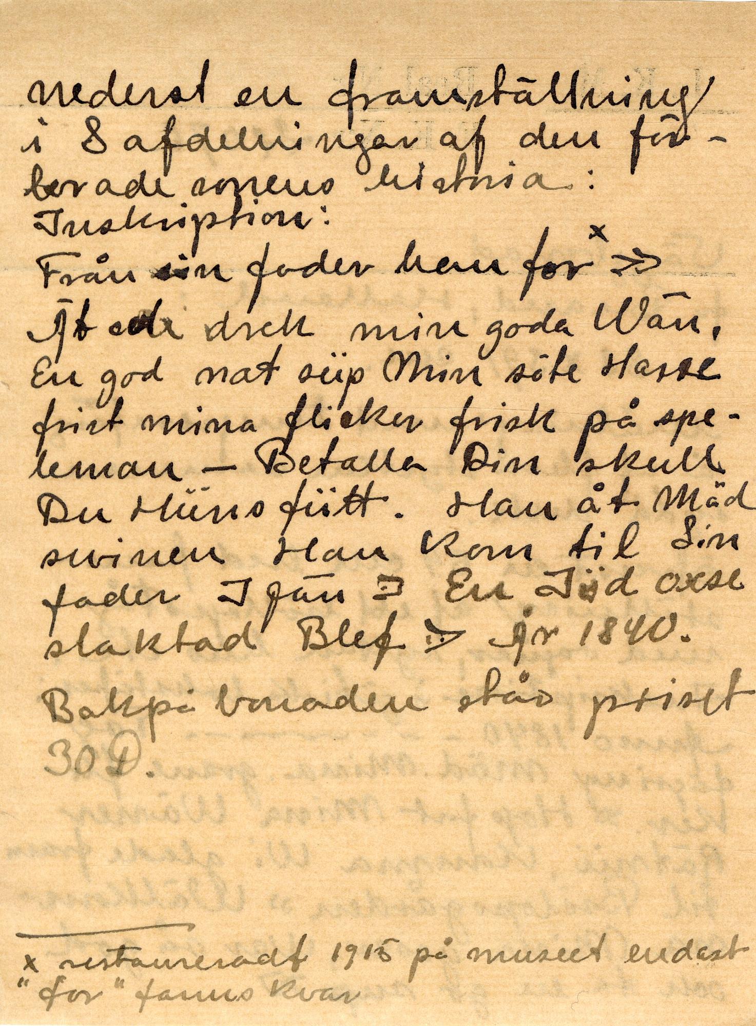 - Övre bildraden framställer ett bröllopståg. Den nedre, den förlorade sonens historia. Överskrift till övre bildraden; "Anno 1840.../Tag fägning(?) mäd mina grane flikor. hop fort mina wänwe. Rätnu komma wi glade fram til Brölopsgården. Wälkomna mina gosar war så god och ta en go sup." Överskrift till nedre; "från sin far han for. Ät och drek min goda wän. En god nat sup söte harre, frist mina flickor, frist på speleman. Betala din skull du huns futt (hunssott). Han åt mäd swinen. Han kom til sin fader iiän (igen). En jöd oxe slaktad. Blefo år 1840." Målat i; tegelrött, blått, gråblått, rödbrunt, rödlila, grönt, gult, svart och vitt mot gråvit botten. Målningen är på sina ställen hårt restaurerad och kompletterad med oriktiga färger. Väven ihopsydd av flera delar. Färgbortfall.