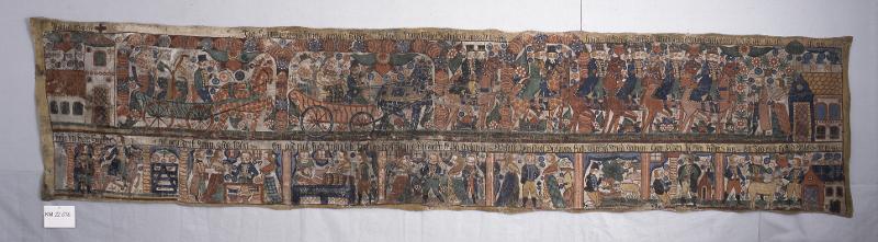 Övre bildraden framställer ett bröllopståg. Den nedre, den förlorade sonens historia. Överskrift till övre bildraden; "Anno 1840.../Tag fägning(?) mäd mina grane flikor. hop fort mina wänwe. Rätnu komma wi glade fram til Brölopsgården. Wälkomna mina gosar war så god och ta en go sup." Överskrift till nedre; "från sin far han for. Ät och drek min goda wän. En god nat sup söte harre, frist mina flickor, frist på speleman. Betala din skull du huns futt (hunssott). Han åt mäd swinen. Han kom til sin fader iiän (igen). En jöd oxe slaktad. Blefo år 1840." Målat i; tegelrött, blått, gråblått, rödbrunt, rödlila, grönt, gult, svart och vitt mot gråvit botten. Målningen är på sina ställen hårt restaurerad och kompletterad med oriktiga färger. Väven ihopsydd av flera delar. Färgbortfall.
