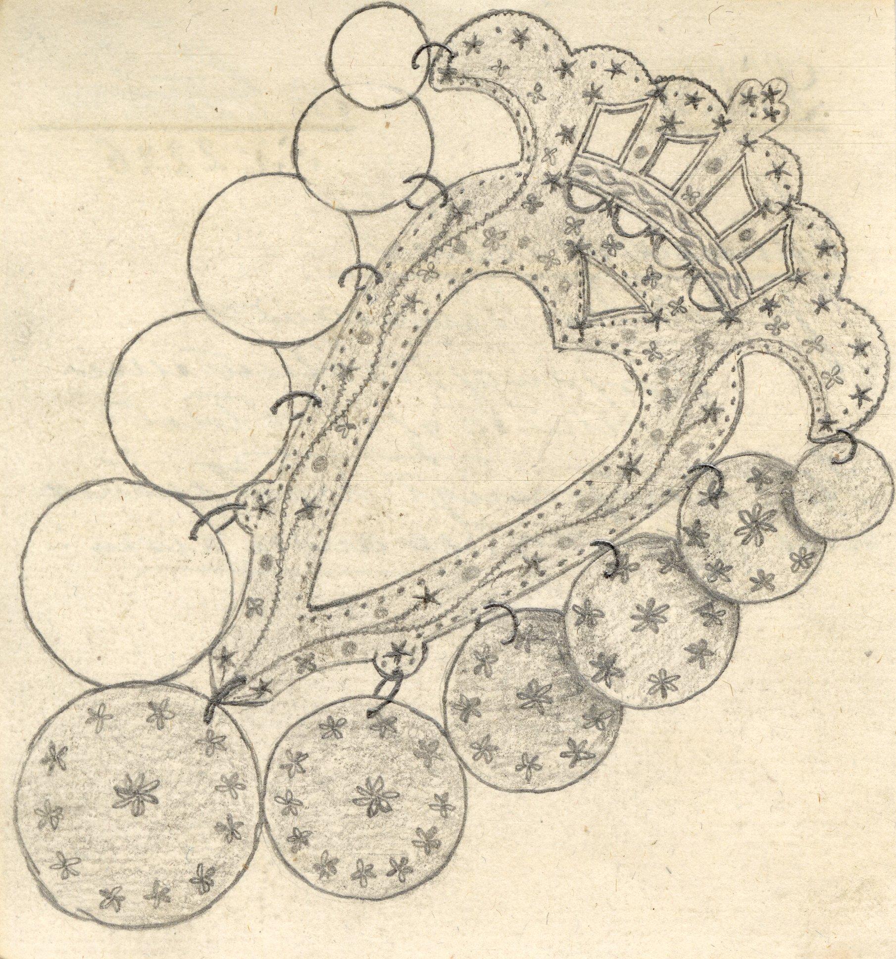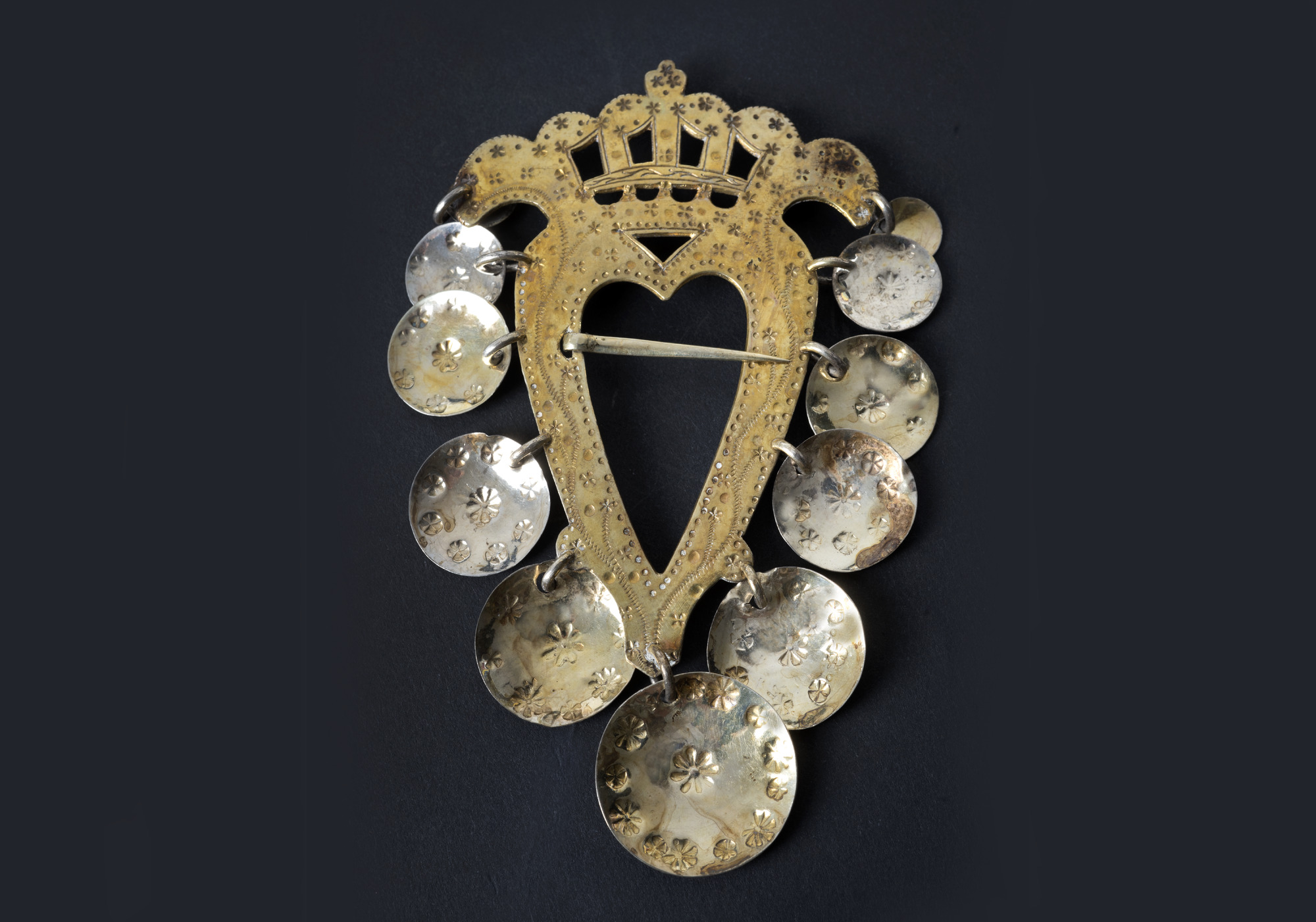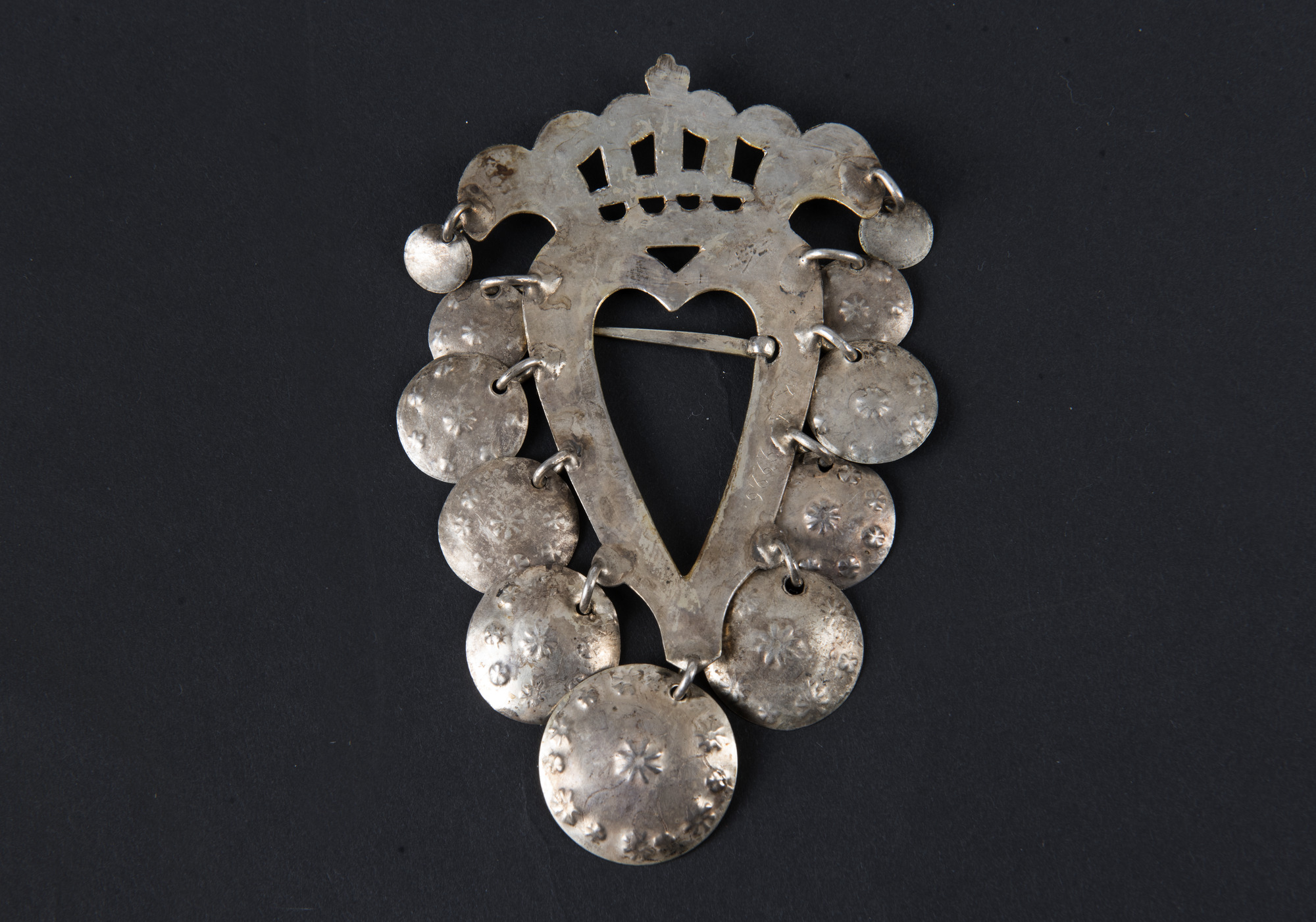 Stort hjärtformigt krönt spänne med 11 löv. Löven med punsad stjärndekor, själva spännet med samma dekor samt graverade eller svisselerade slingor. Framsidan förgylld.