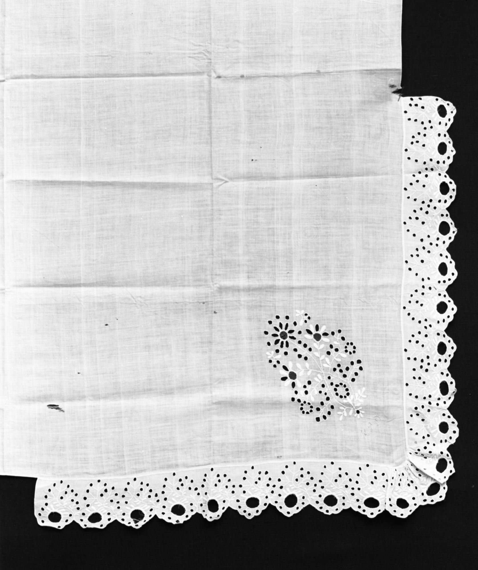 KM 70367. Klut, vit bomullstyg. Broderad och över spetskant, broderad udd. Skåne, Luggude.