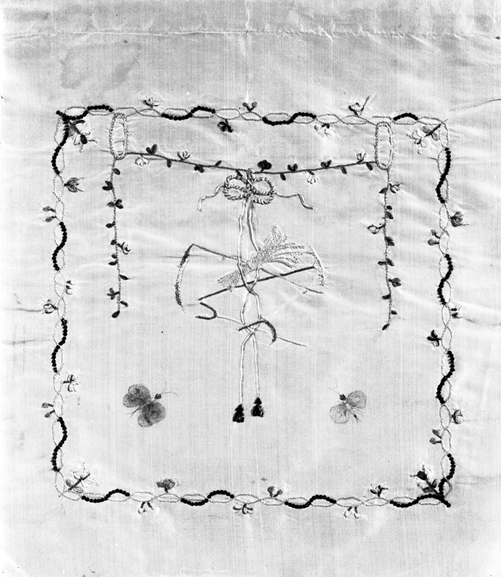 KM 4668. Damväska, siden, brod. Detalj. Omkring 1800.