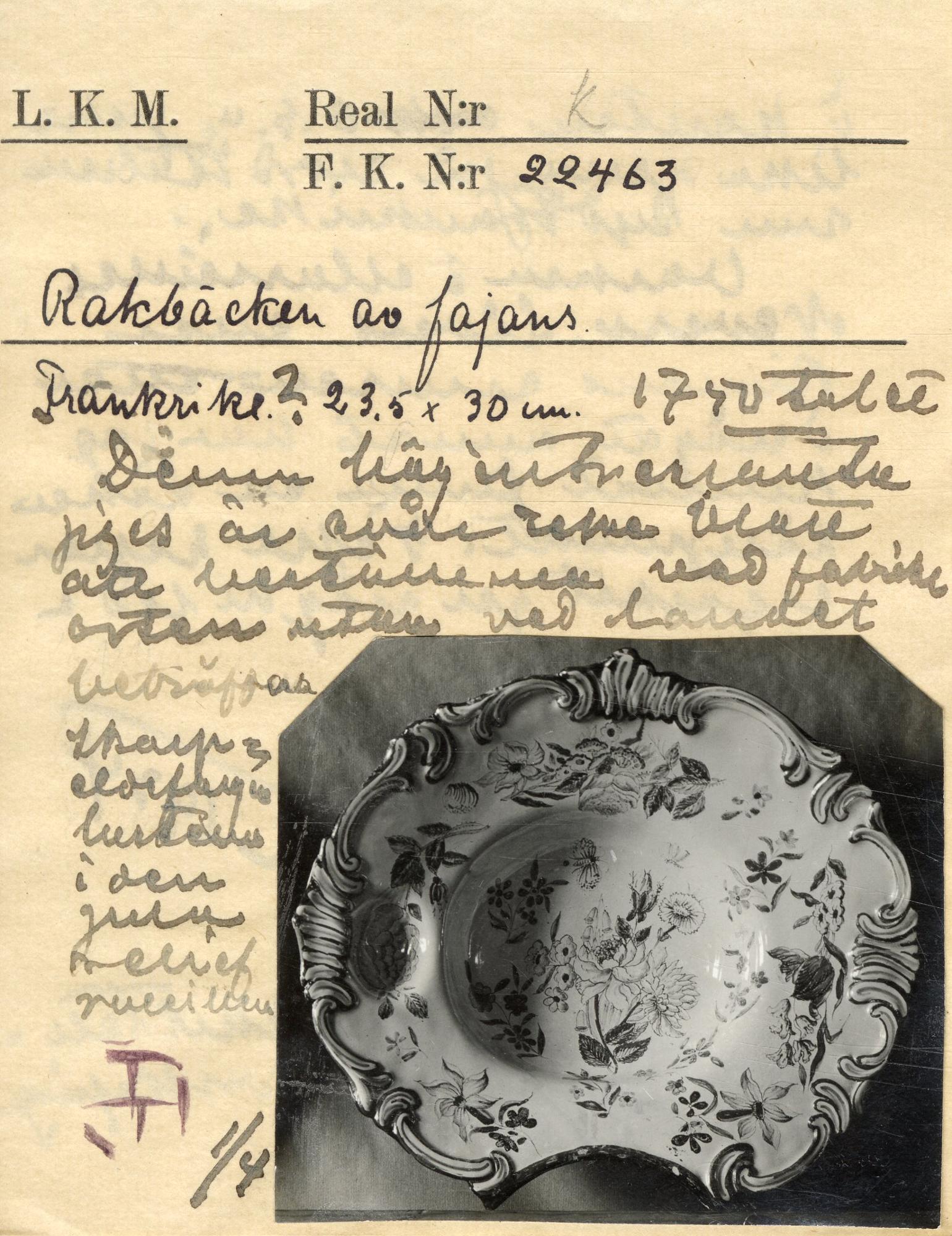 "Fajansfatet har ursprungliga upphängningshål i fotringen och en oval fördjupning i brättets vänstra sida."