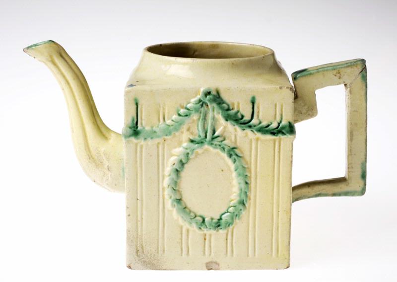 Kvadratisk med kannelerade sidor, lagerfestonger och medaljonger i relief. Lagerrankan grönmålad. (Se även Karlins katalogkort. )