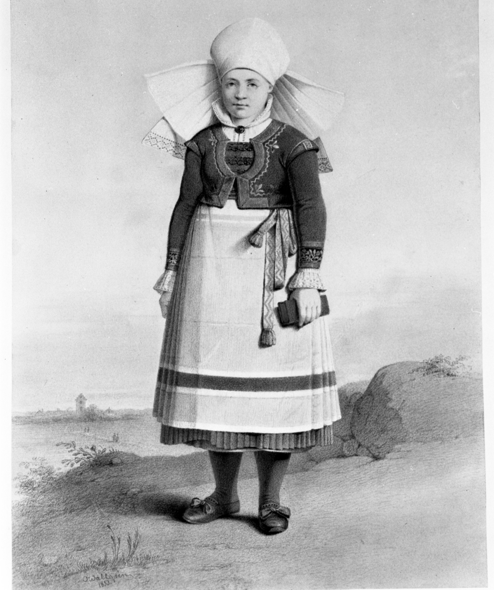 Otto Wallgren "Skånska allmogens klädedräkter". Kvinna, Herrestads Härad.