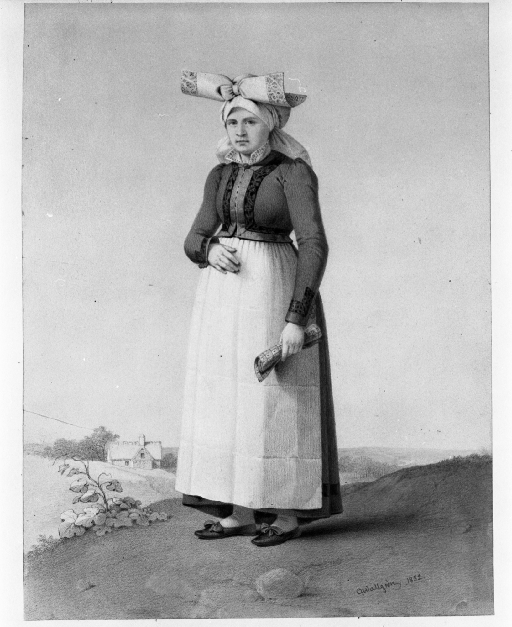 Otto Wallgren "Skånska allmogens klädedräkter". Kvinna, Albo Härad.