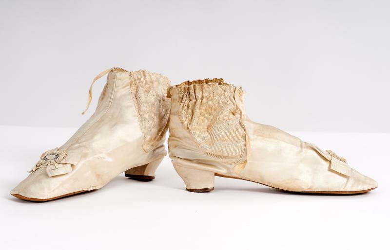 Vitt siden med resår i skaftet. Sidenrosett och stålspänne. Svängd klack. Rätt låg. Hopdragbar upptill. Mellanbrun lädersula. Mått: klack H 3 cm, Br 3,3 cm. Defekter: resåren slapp; trasigt i sidentyget speciellt i kanterna mot sulan, även bak vid hälarna; den ena hälsömmen lagad; ljusbruna fläckar på fält i tyget samt svärtat; ihoptryckta bak i hälförstärkningen.