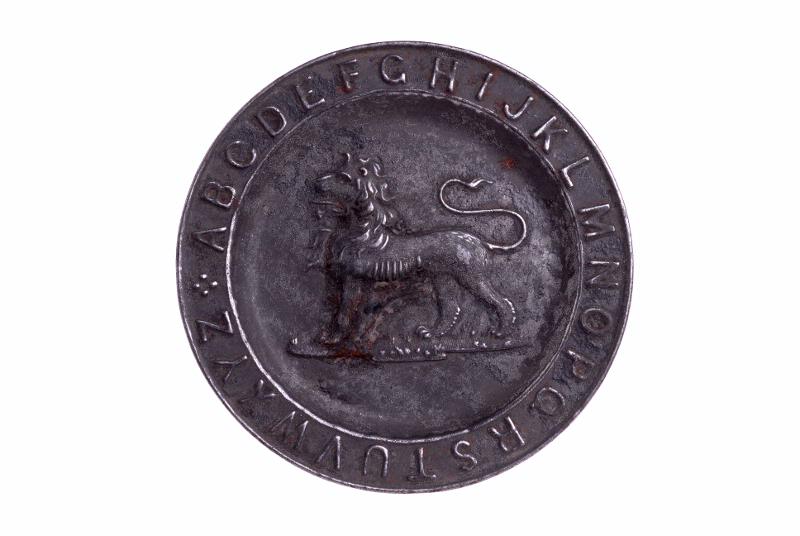 Pressad bleckplåt. Rund. På brättet alfabetet i versaler, A-Z, i relief. På spegeln ett lejon i upphöjd relief. Brättets bredd 0,8 cm. Vårdåtgärder: rengjort med pensel.