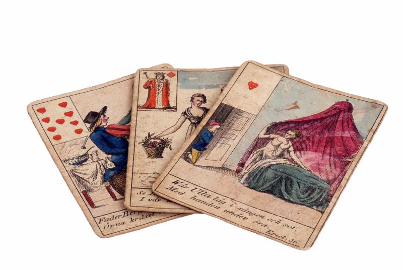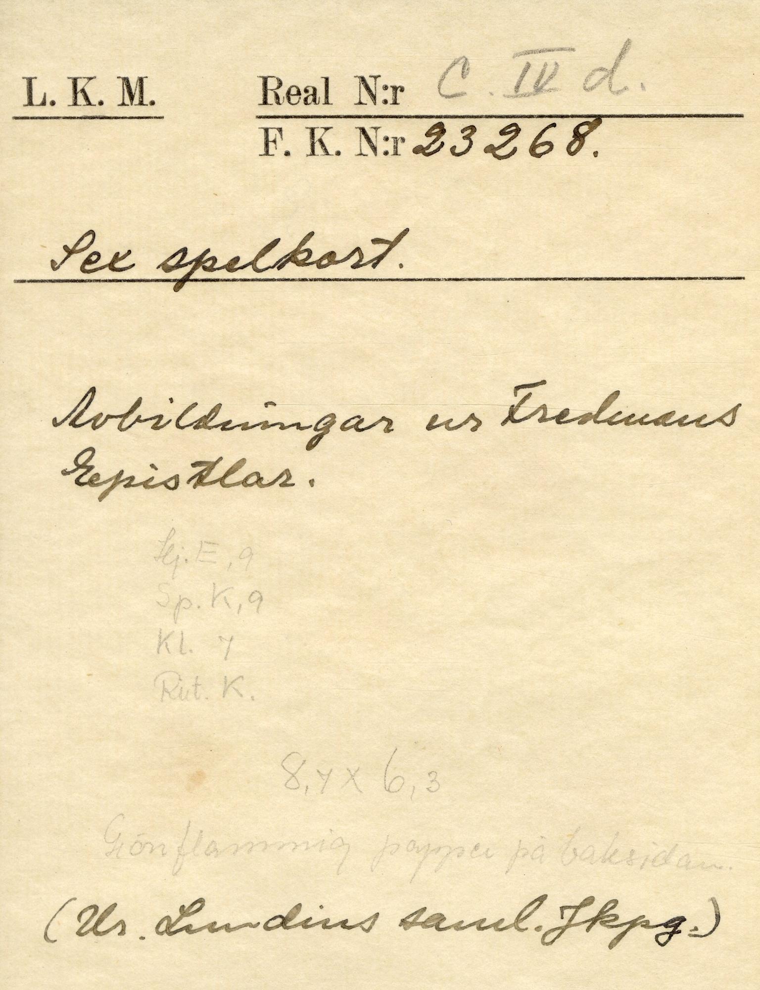 - Sex spelkort (Fredmans epistlar). Hjärter 9, ess, spader kung, nio, Ruter kung och klöver 7 ur leken "Löjliga spelkort med scener ur Fredmans Epistlar" Se KM 18751. Baksidan grön med bruna flammor. Tunnan på hjärter 9 är märk med initialerna D.Ö. Skiljer sig från den leken 18751 genom att bakgrunden på de flesta korten fått en färgton och målningen överhuvud är något sämre än på den andra.