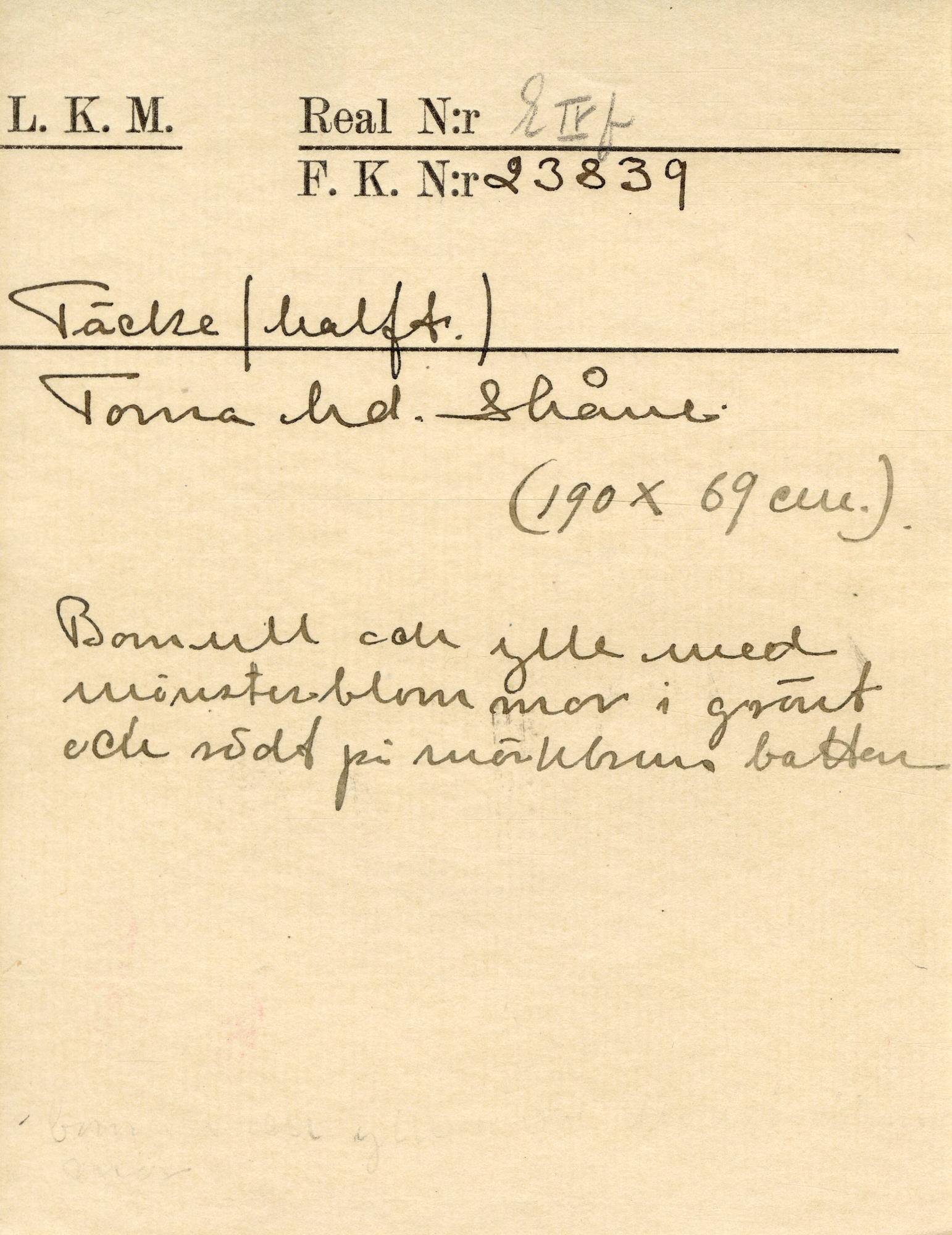 KM 23839 :: täcke del av, täcke, bänklängd, längd
