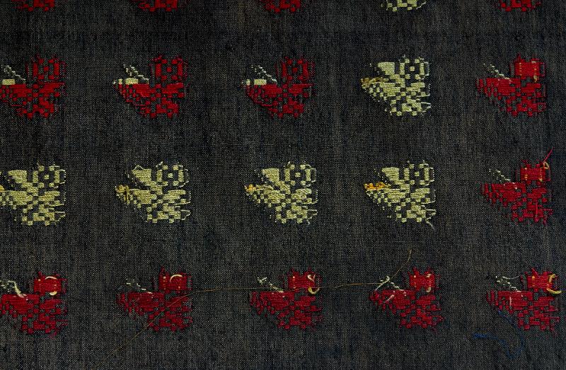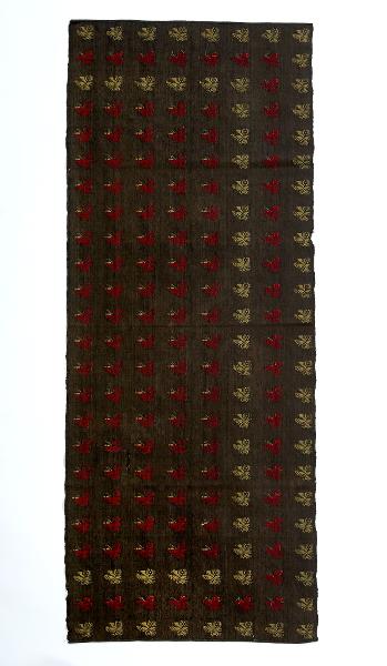 Blomkvistar i rött och ljusgrönt, i rader. Botten i brun bomulls varp med svart ylleinslag.