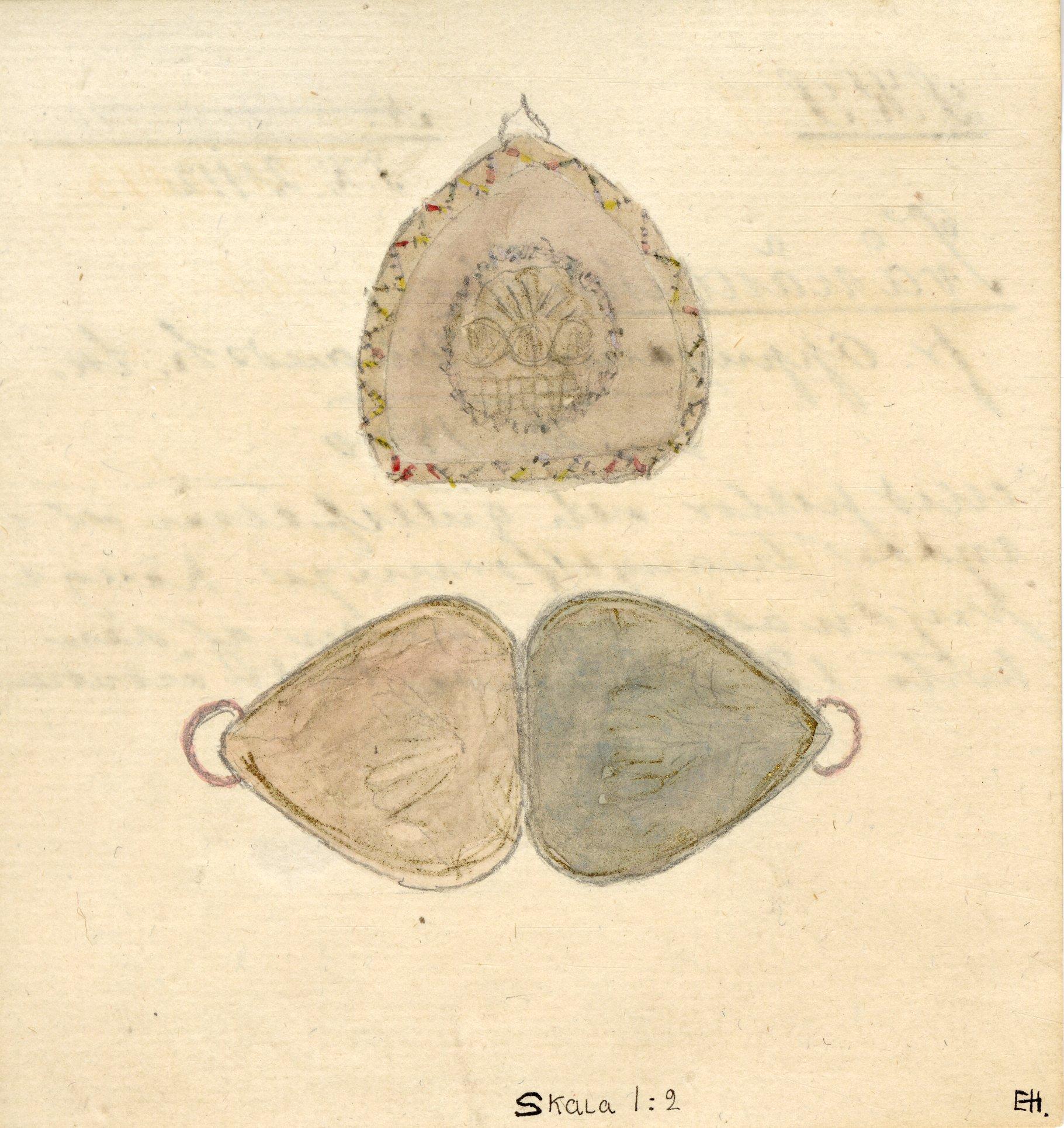 Två näsdukstofsar fr. Oppmanna. Villands h. Sk. omkr. 1800 Med perlor och gullspetsar utsydda triangelformiga hängeprydnader för hörnen af den hvita hålsömmade brudnäsduken. [avbildade i skala 1:2 på katalogkortets baksida]