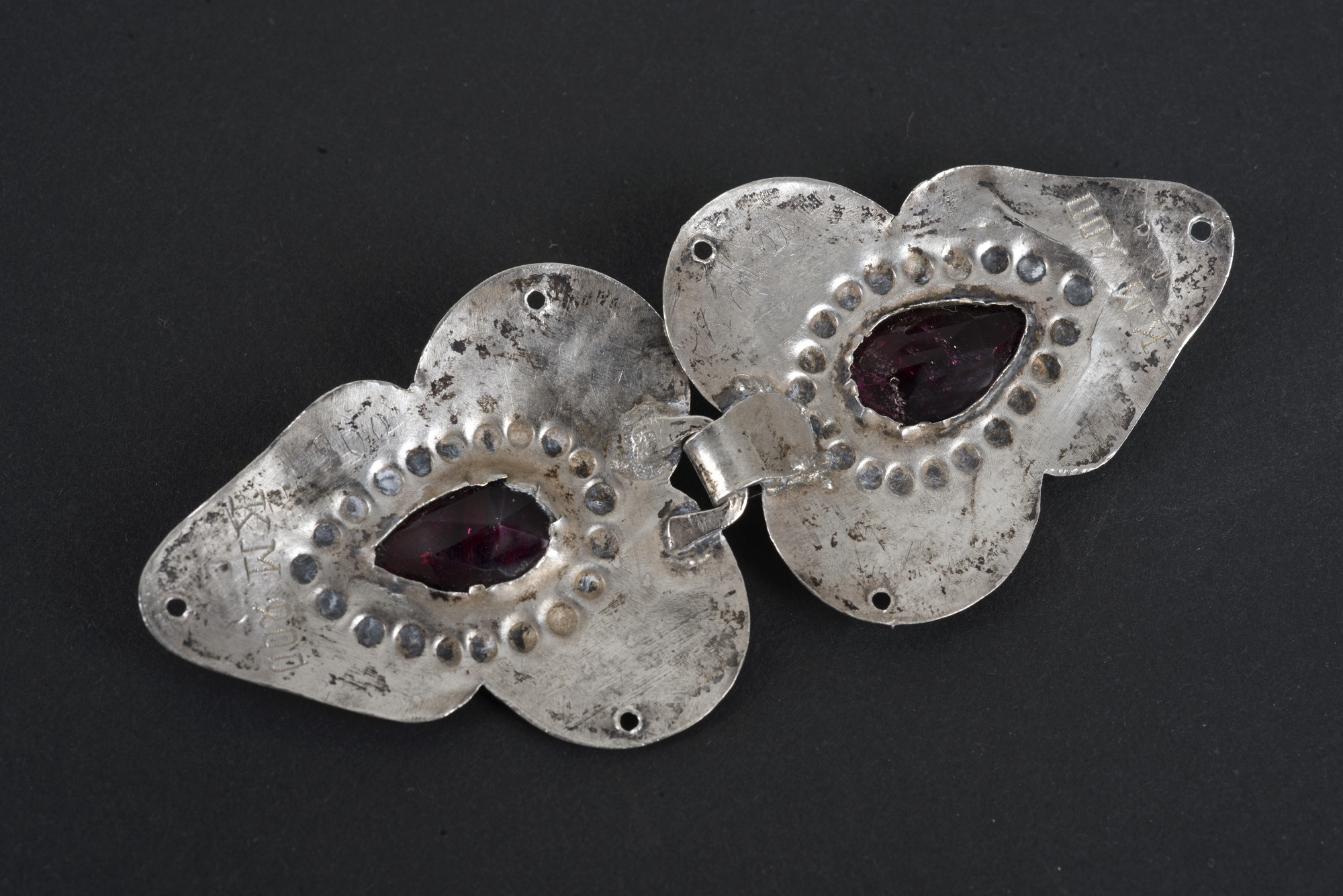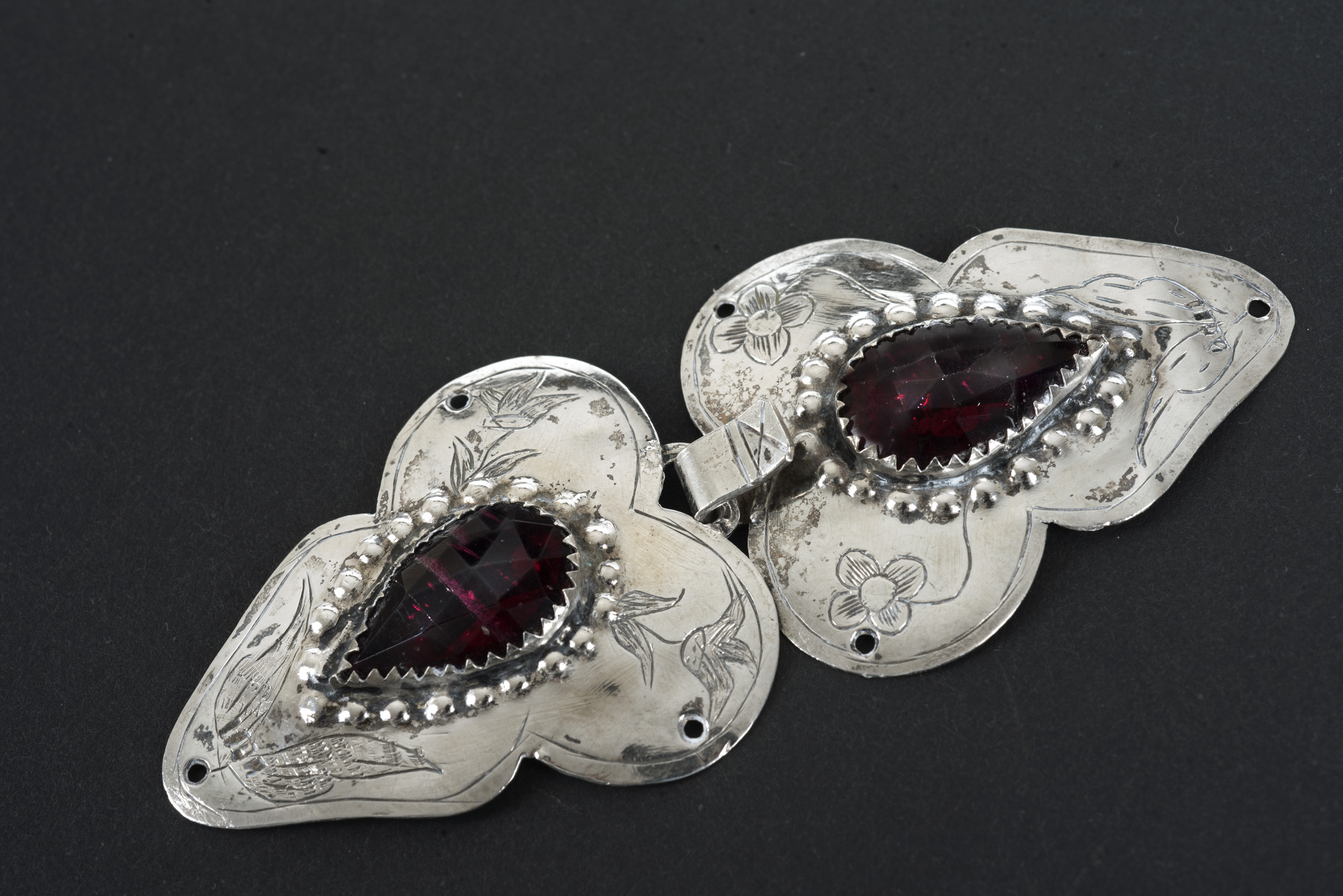 Bladformade med infattade röda facetterade droppformade glasfluss infattningen omgivna av små bucklor, graverad dekor med blommor och blad.