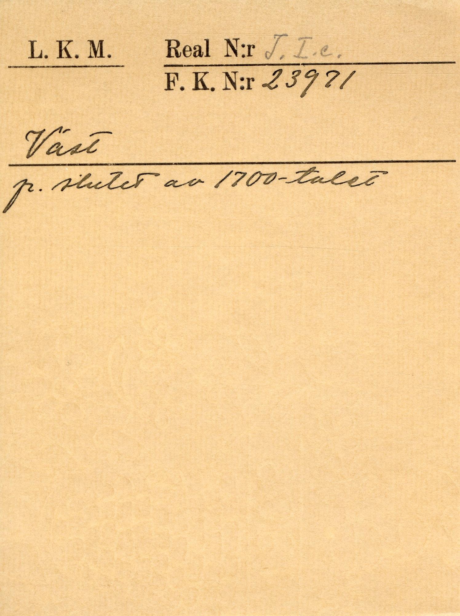- Vitt ripssiden med schattersömsbroderi i gult, vitt, grönt och violett. Foder och ryggstycke av kraftigt bomulltyg i tuskaft. I kragen ett mellanlägg av papper, sidenfodrat. Knäppsfram med 11 st av silketråd överklädda knappar i grönt och vitt. Från ryggsömmen fram över vänstra axeln har senare en kil av grov linneväv blivit isydd. Ryggsömmen uppsprättad. Mycket fläckig baktill, november 1994.