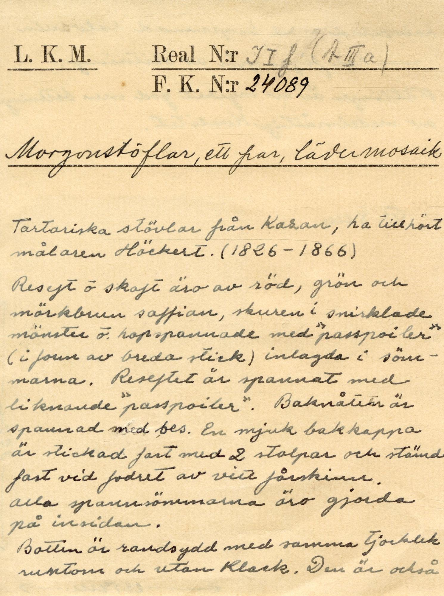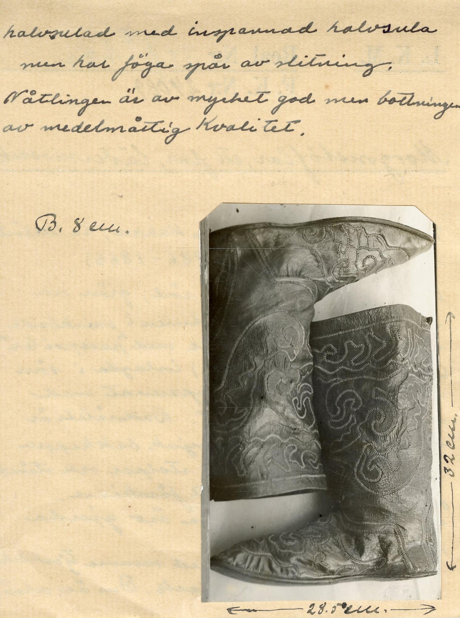 Reseft och skaft äro av röd grönt och mörkbrun saffian, skuren i snirklade mönster och hopspannade med "passpörler" (form av breda stick.) inlagda i sömmarna. Baknåten är spannad med bes. Reseftet är spannat med liknande "passpörler". En mjuk bakkappa är stickad fast med 2 stolpar och stämd fast vid fodret av vitt fårskinn. Alla spannsömmarna äro gjorda på insidan. - Botten är randsydd med samma tjocklek runtom och utan klack. Den är också halvsulad med inspannad halvsula men har föga spår av slitning. Nåtlingen är av mycket god med bottningen av medelmåtlig kvalitet.