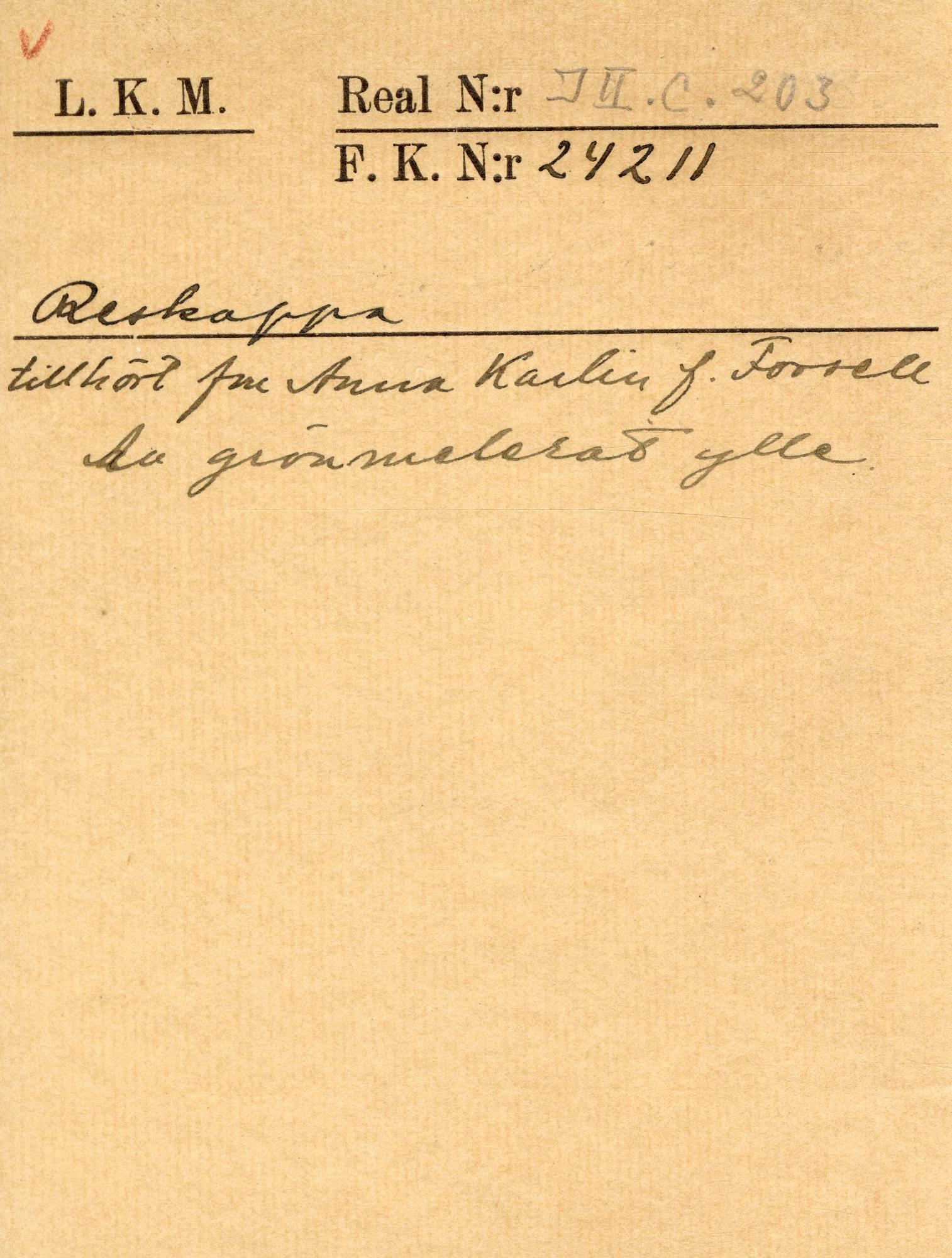3-delad. Mörkt ylletyg, övervägande svart med invävda knottriga trådar, bildande rutor. Färger: ljusbått, gulgrönt och grått. Besättningsband av blågrönt, metallskimrande siden. Koftan har rysch av ylletyget kring kragen, handlederna, axelvolangerna och helt runt om. Koftan fodrad med svart blankt halvylle, isättningen oh västen med grått bomullstyg, isydda fiskben, kjolen med svart bomullstyg. Skoning av ungefär 12 cm bred yllerips. Lagad med grönt ylletyg. De gröna banden på koften är delvis borta.