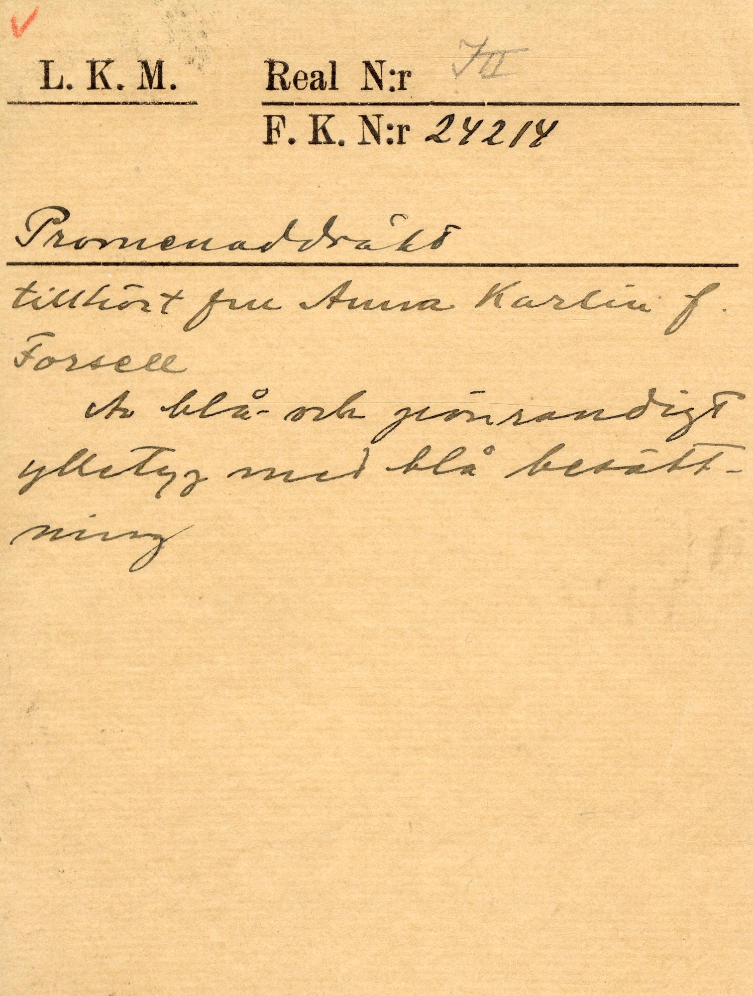 "Kappa av ylletyg, förmodligen sydd i Lund 1896-97. Har tillhört Anna Karlin."