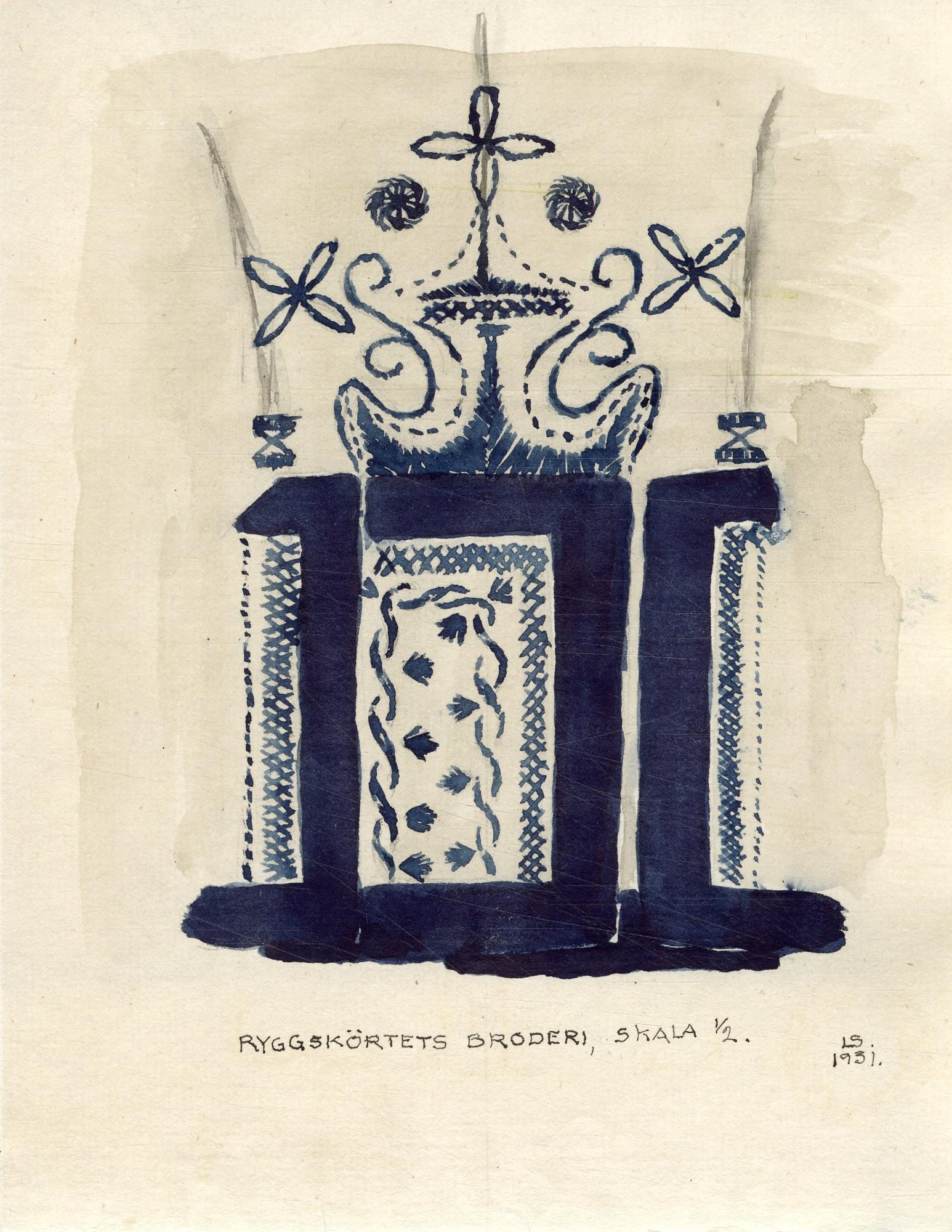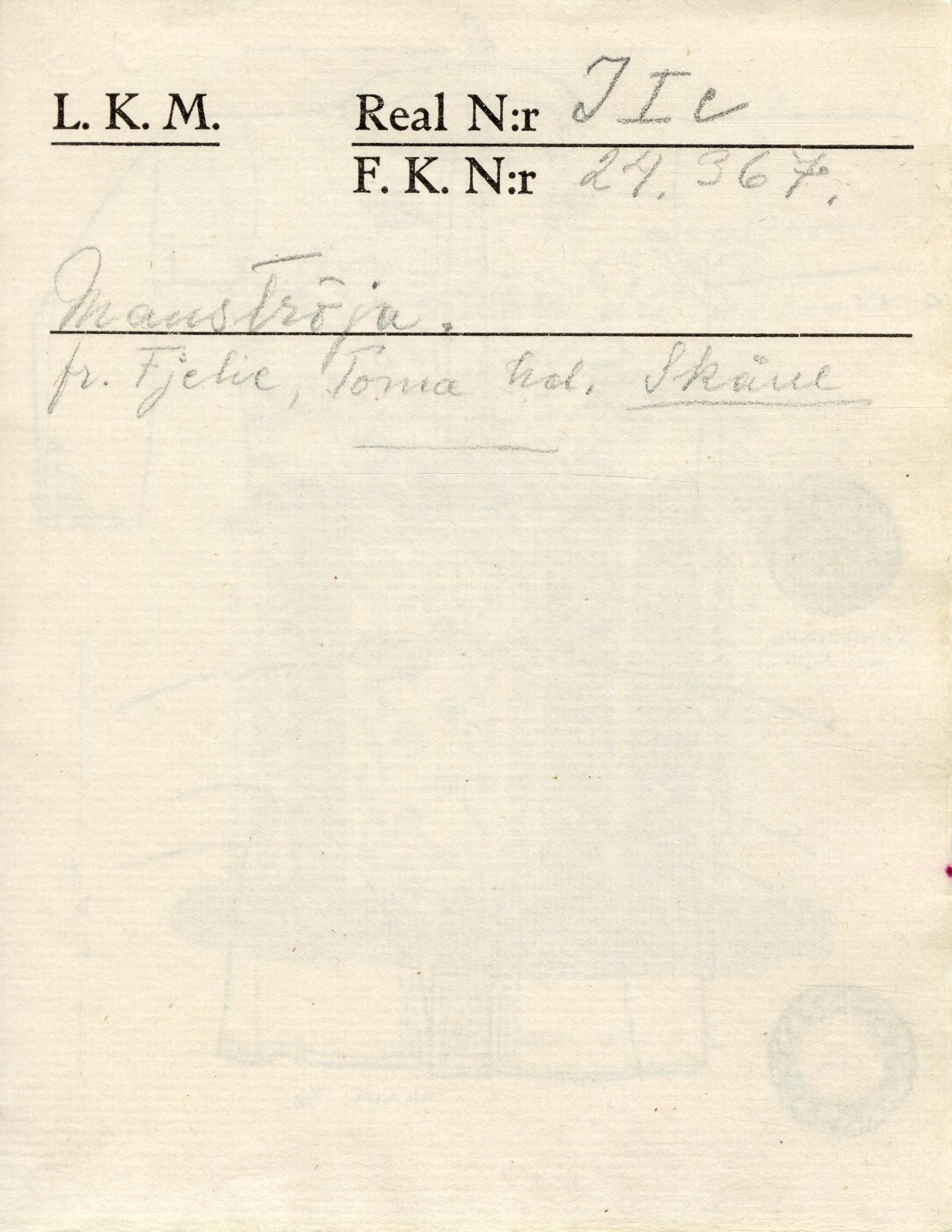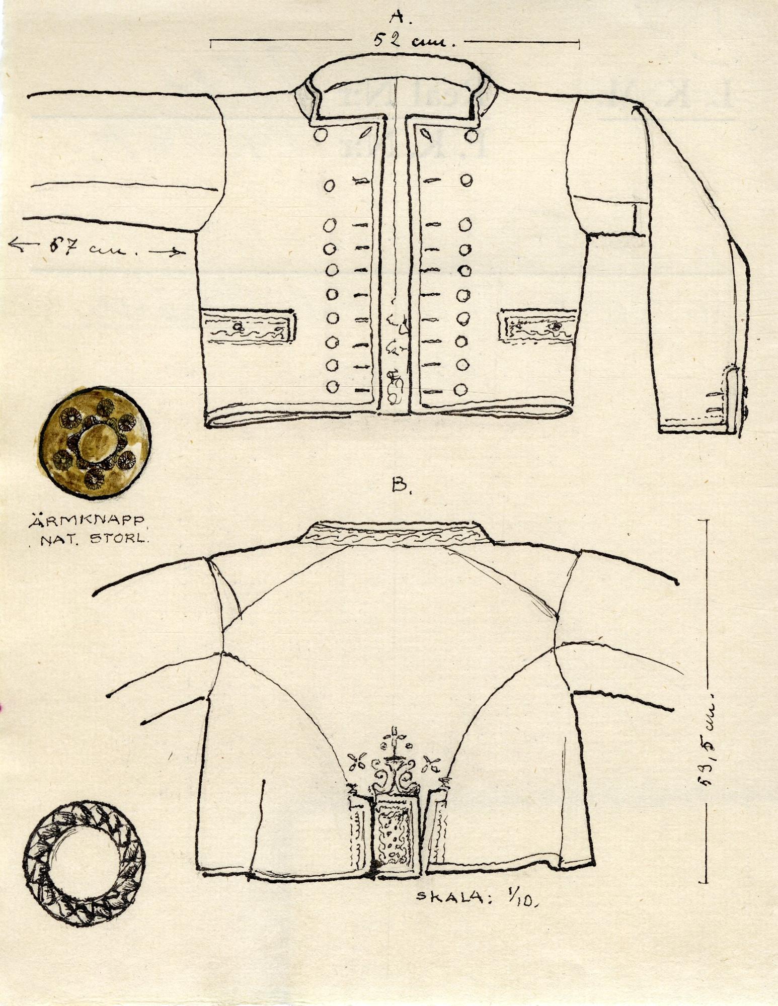 - Vit vadmal, kantad med mörkblått linne. Broderier i mörkblått kring ståndkragen, på ficklocken och ryggens mittsöm. Dubbelknäppt med 10 mässingsknappar på var framsida, mörkblå knapphål. Linnefoder. [avritad på katalogkort] Kantbandet mycket trasigt, fläckar och malhål.
