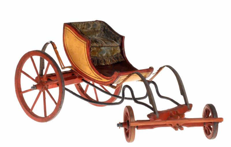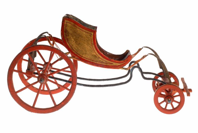 - Typ damfaeton. Utvändigt gulddekor och inuti rödbrunmålat med grågrön sammetsklädnad. Läderremmar upphängda i upprätstående järnfjädrar. Bakre hjulparet större än det främre. Underrede i rött. Tistelstången delvis ny.