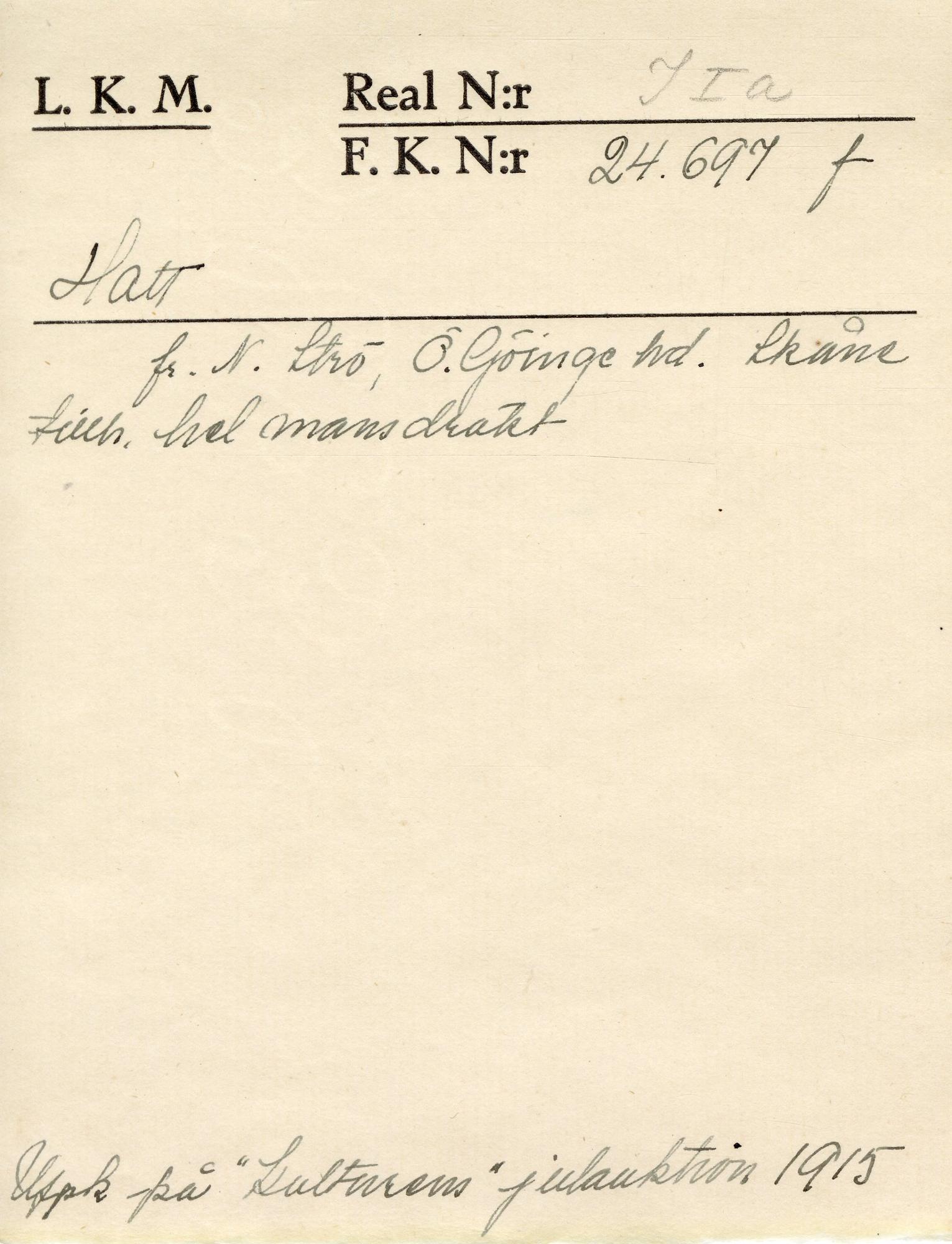 Svart filt. Kullen mycket hög, bredare upptill. Litet brätte.