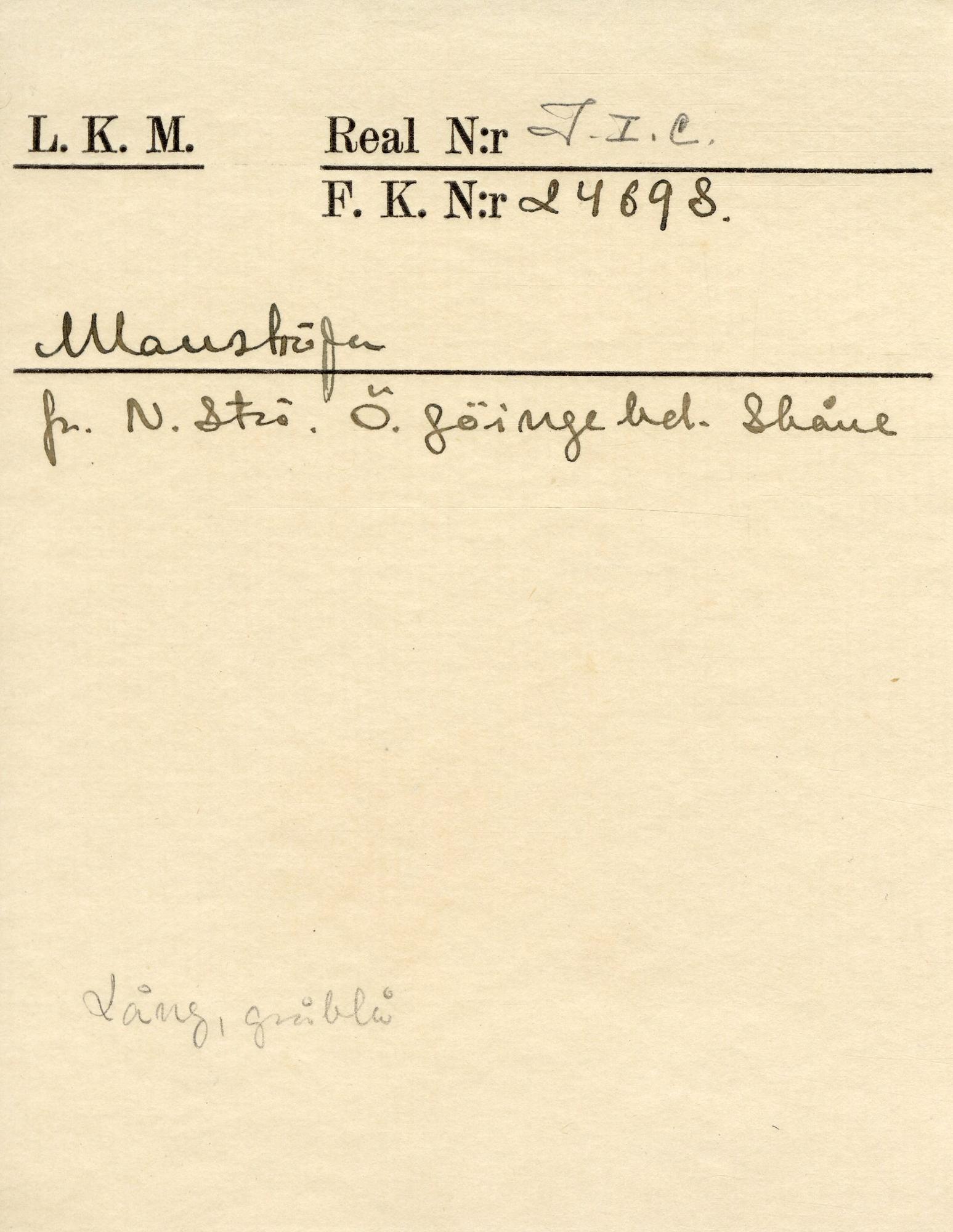 - Gråblå vadmal. Enkelknäppt, mässingsknappar. Linnefoder, grovt i olika nyanser. Stort skört bak, 41 cm långt. 12 knappar. Ståndkrage. Innerficka i vänster sida. Något maläten, kragen sliten, december 1994.