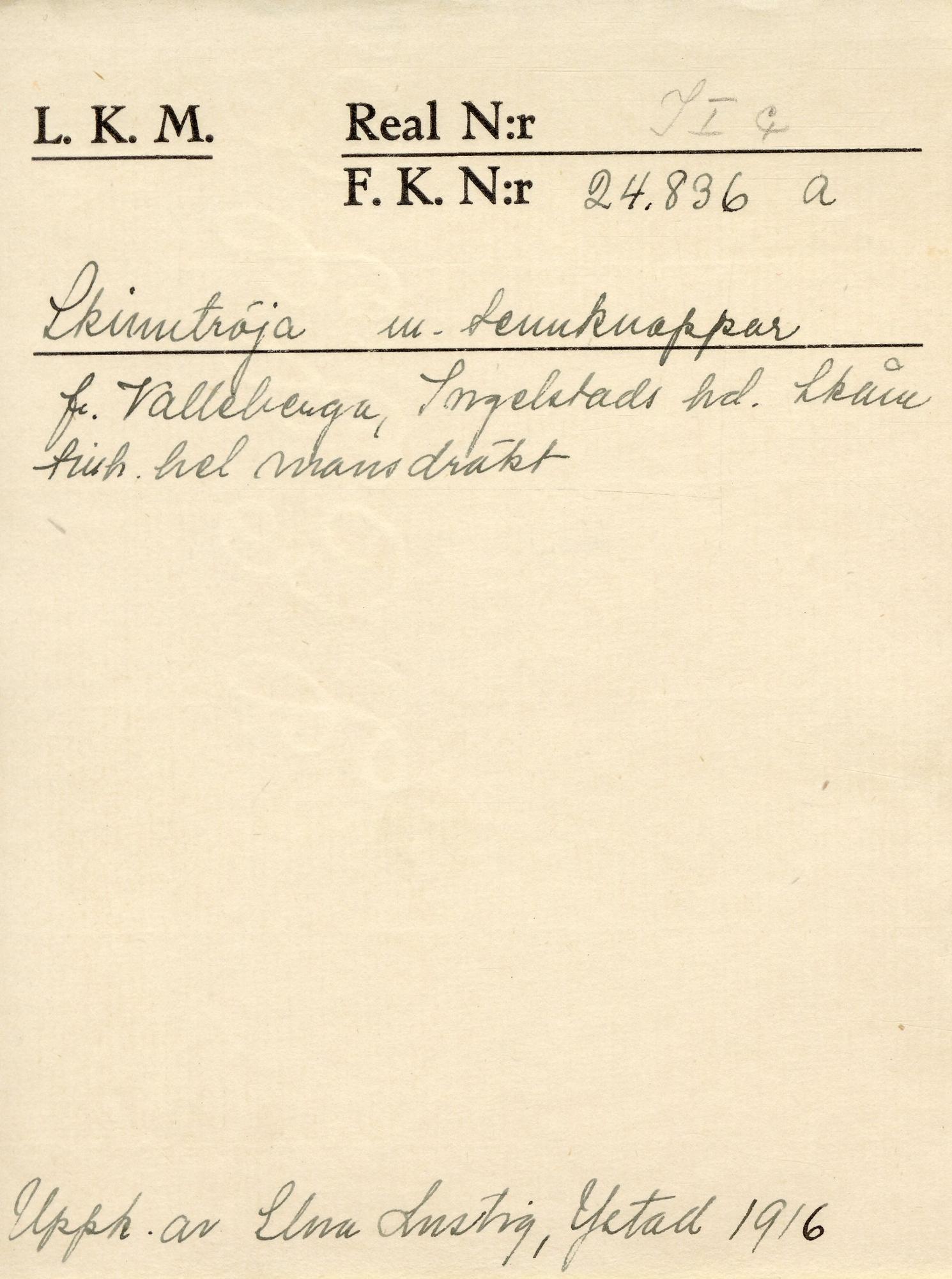 - Skinn. Linnefoder i tuskaft, innerficka i kypert. Söm mitt bak avslutad med sprund. Kilar och sprund i sidosömmarna. Ståkrage. Knäppt med 12 metallknappar [tenn enligt huvudliggartext] varav 2 saknas och hål utmed framkanterna. Laskning utmed framkanterna. Broderad blomma ovanför sprundet mitt bak.