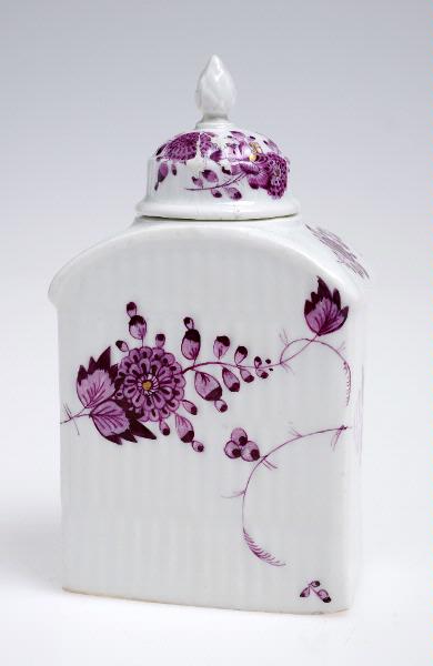 Rektangulär botten, välvd skuldra. Räfflad yta med kakiemondekor i purpurcamaïeu och guld, indianska blommor.