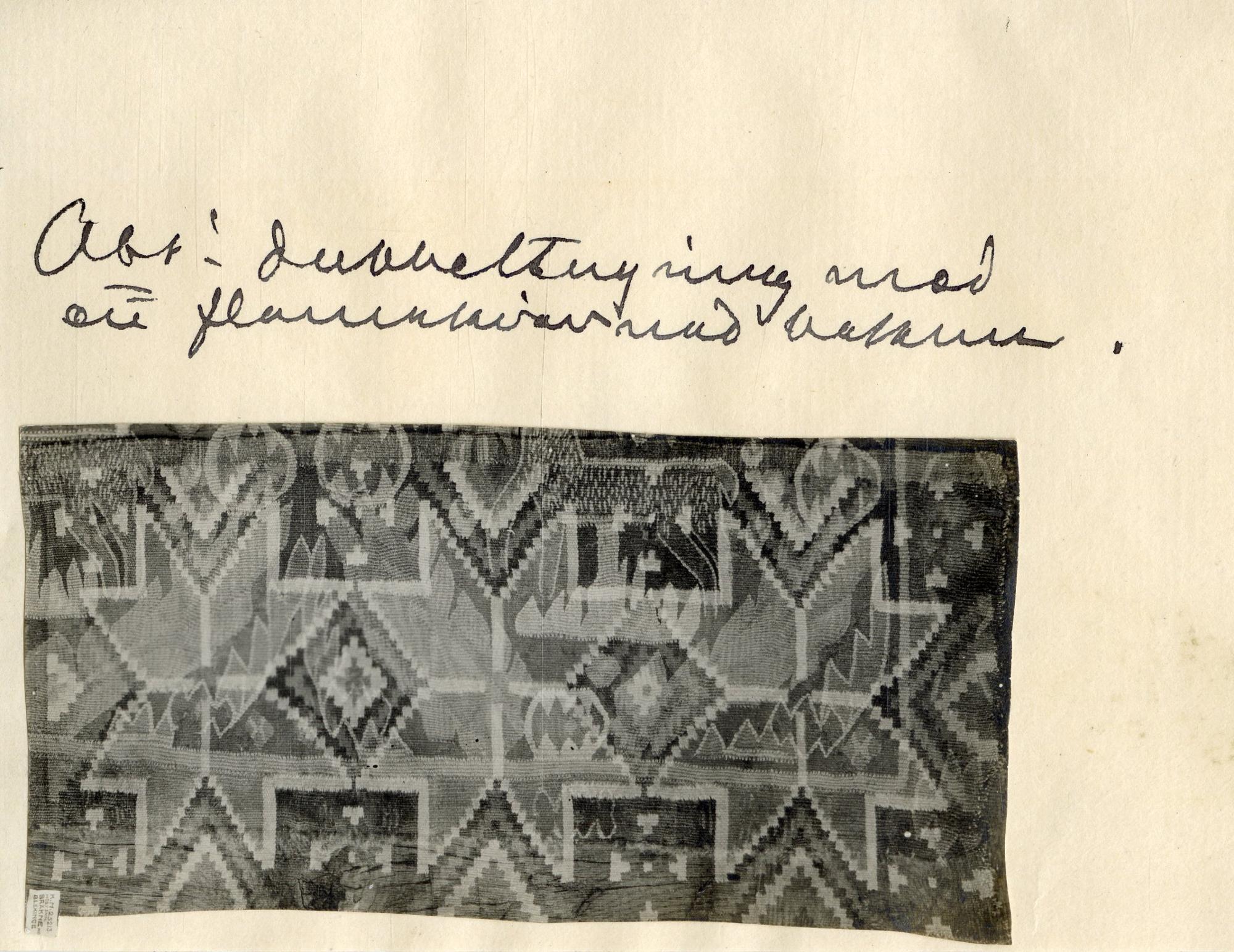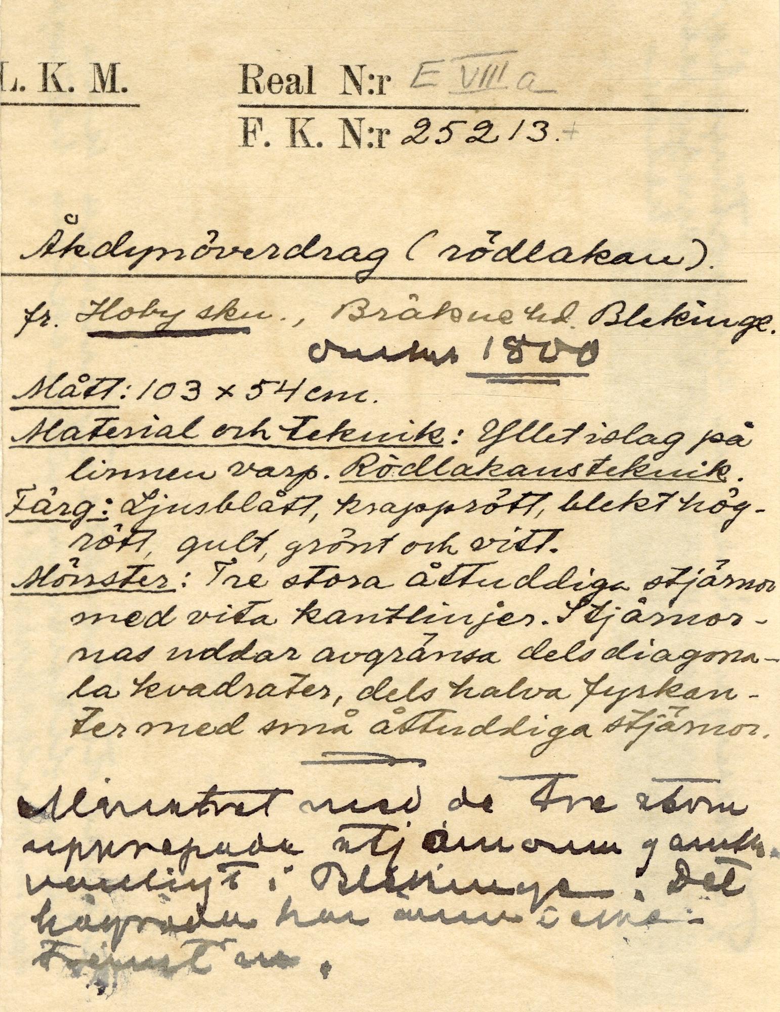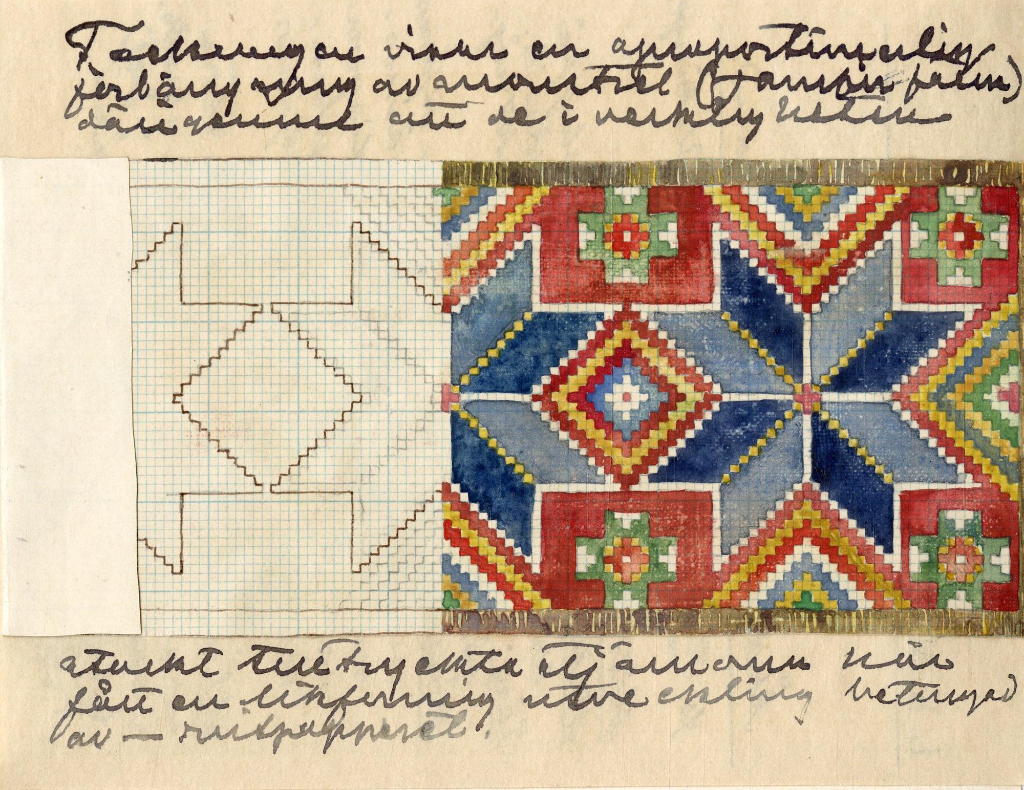 Olika blå nyanser, rött, grönt, gult, vitt, rosa. Runtom en kant i spräckliga färger, delvis lagad. Saknar bakstycke.