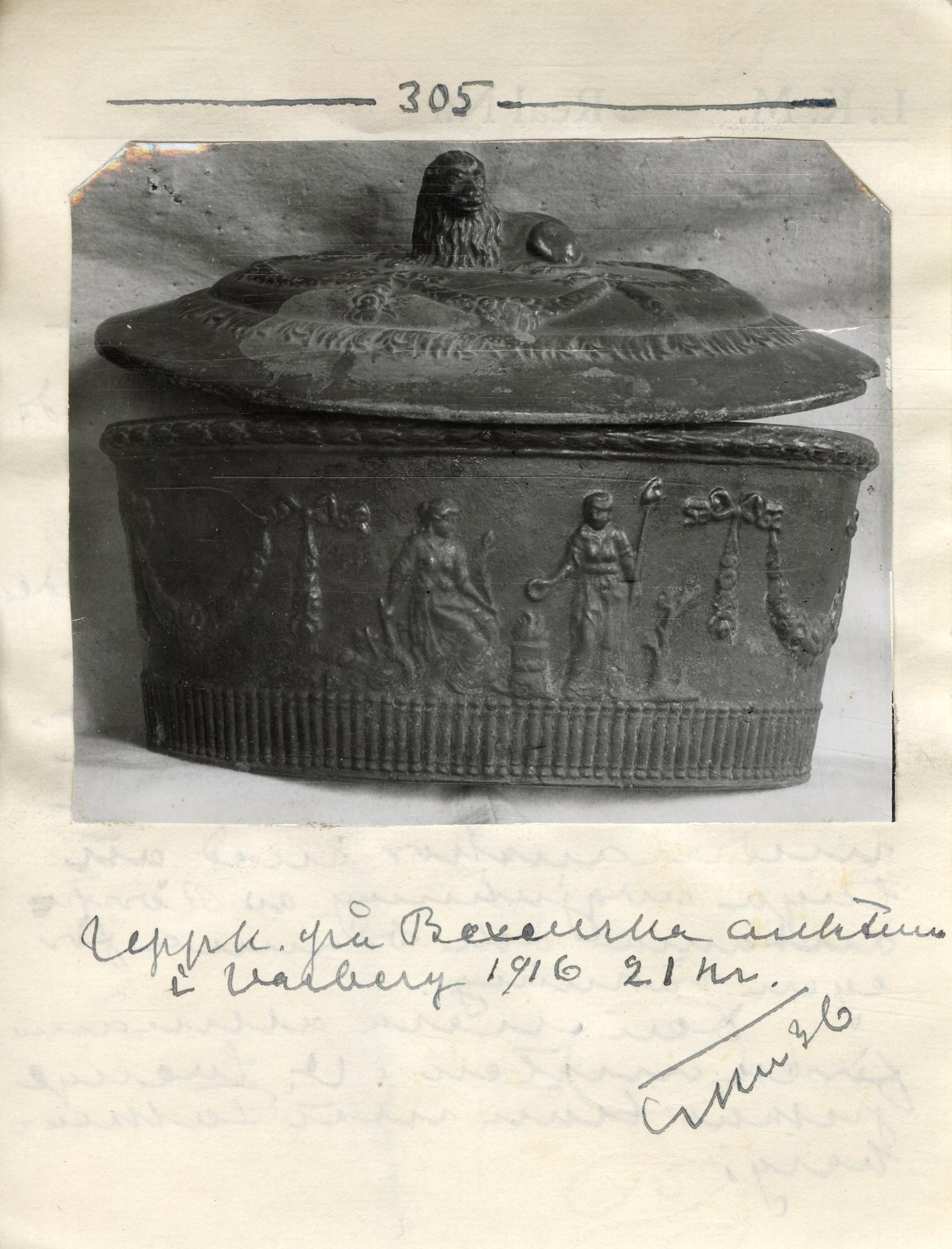 - Oval med rak kärlvägg och utkragad mynningskant. Ovanpåliggande välv lock med ett liggande lejon som knopp. Dekorerat med festonger i relief. Glaserad i rött på utsidan, insidan oglaserad. Skålen dekorerad med lagerstav, festonger samt figurscener i relief på var sida. Mynningskanten dekorerad med bladrankor i relief. Glasyren sliten och avflagad.