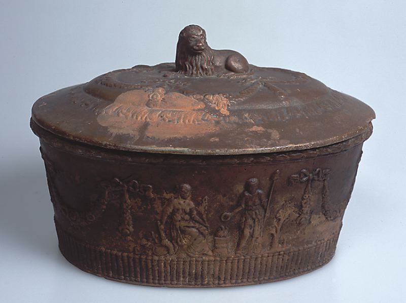 Oval med rak kärlvägg och utkragad mynningskant. Ovanpåliggande välv lock med ett liggande lejon som knopp. Dekorerat med festonger i relief. Glaserad i rött på utsidan, insidan oglaserad. Skålen dekorerad med lagerstav, festonger samt figurscener i relief på var sida. Mynningskanten dekorerad med bladrankor i relief. Glasyren sliten och avflagad.
