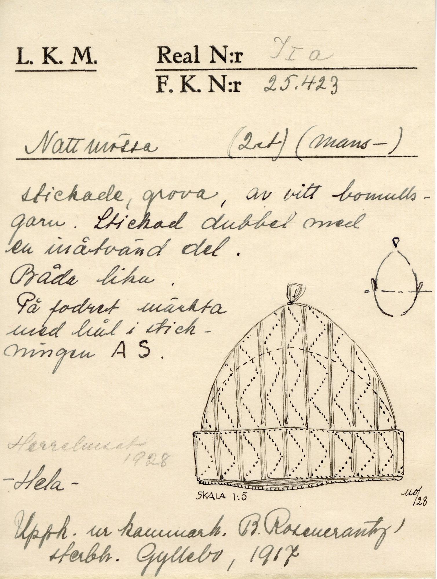 1) Stickad av vitt bomullsgarn. Dubbel så att när den slätstickade insidan drages ut bildar den 2 koner med gemensam botten. Instickat monogram "AS". H 25 cm, Diam 54 cm. Sent 1700-tal eller tidigt 1800-tal.
