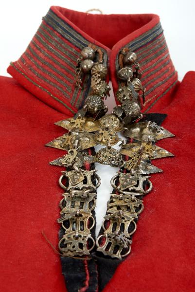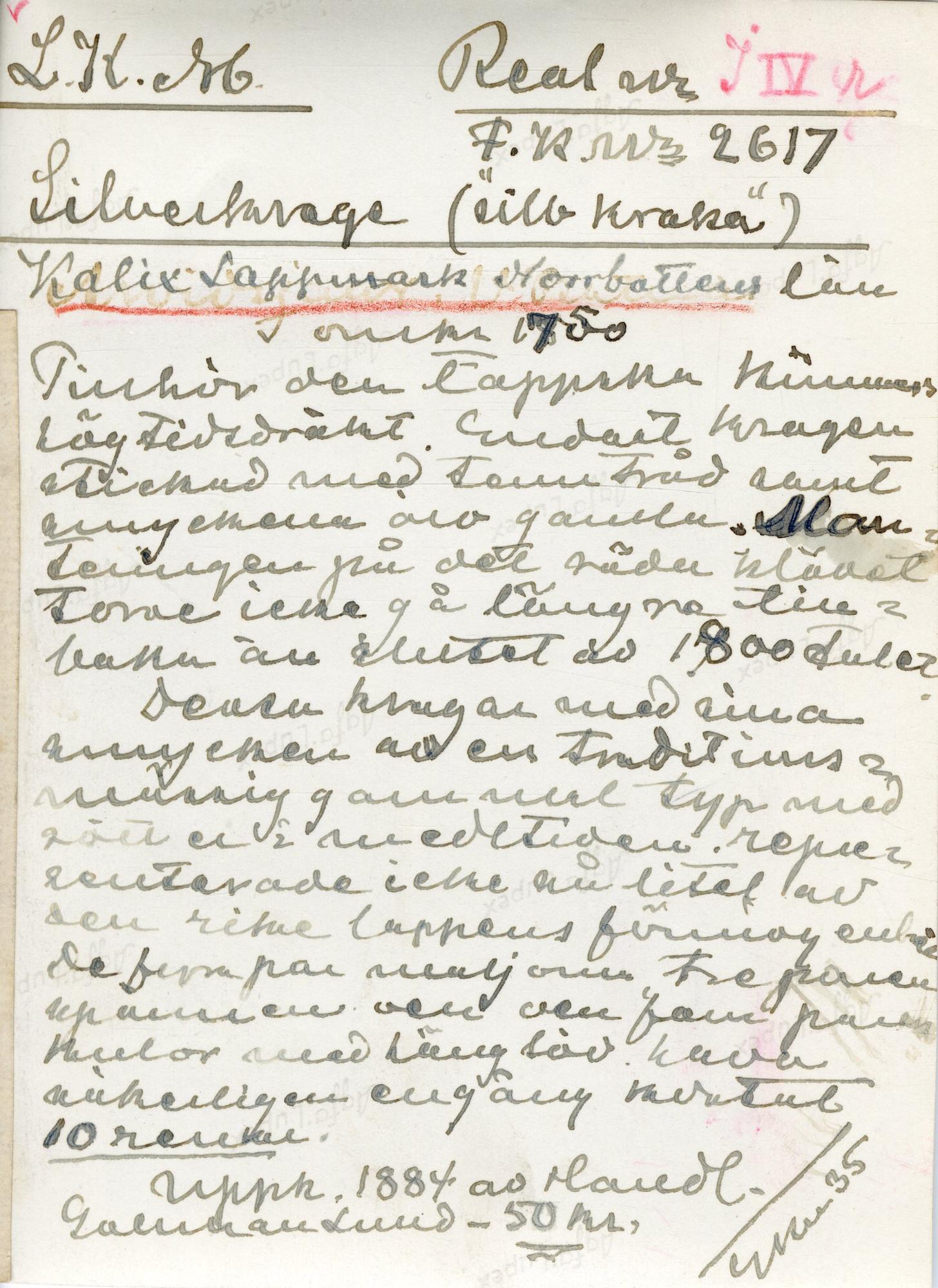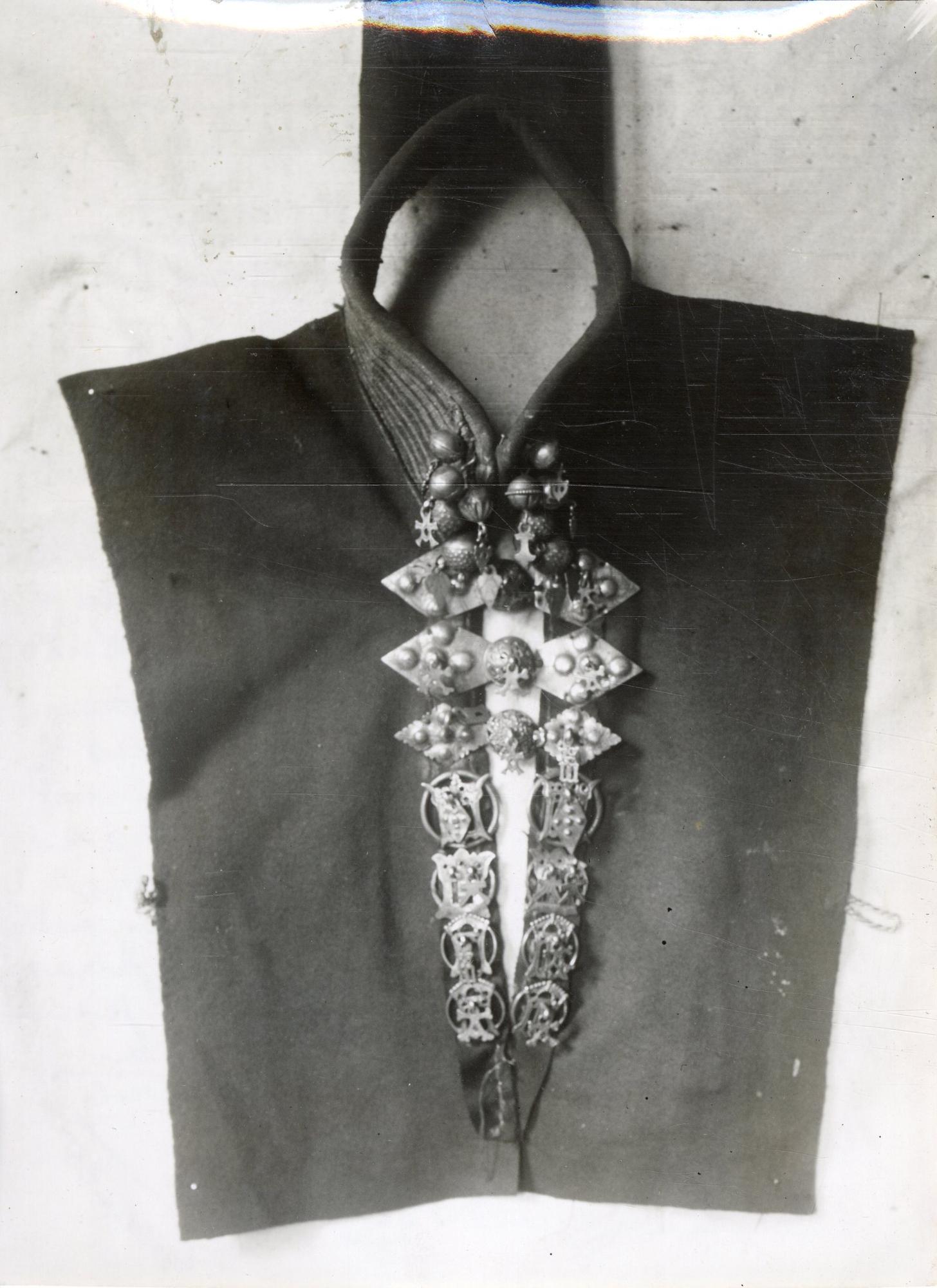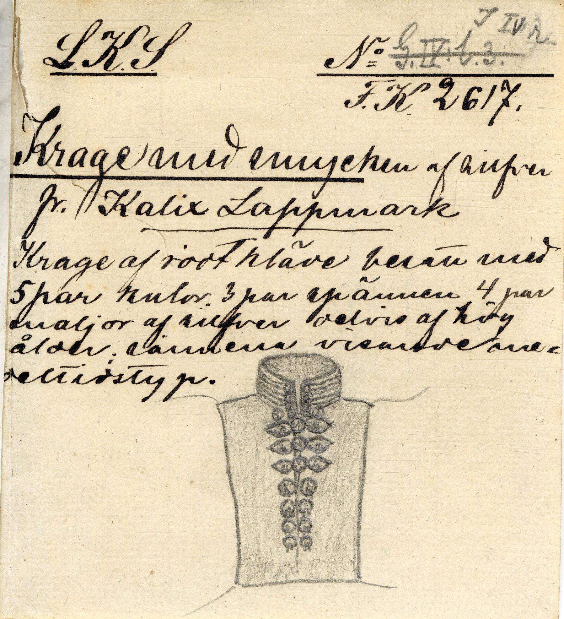 Krage med påsytt dräktsilver (silbkraka). Av röd vadmal med svart kant i sprundet. Stråndkragen är broderad med pålagda tenntrådar och har blå kant. Spännen maljor och knappar är förgyllda eller bär spår av förgyllning. Enligt Karlins katalogkort Kalix lapppmark. Enligt Fjellström (se litt) okänd härkomst. Enligt A-S Svakko sydsamisk.