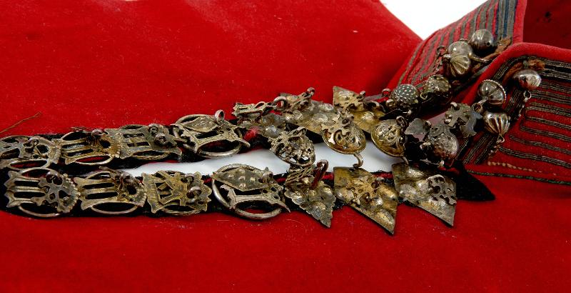 Kragen av vadmal är äldsta delen med rakt tenntrådsbroderi. Tenntråden med sentråd inuti. Tyget i övrigt är utbytt och silvret har monterats om. Silverkulorna har monterats på en skinnrem med sentråd. Silvret i övrigt har monterats om och sytts med björntråd troligen i slutet på 1800-talet.