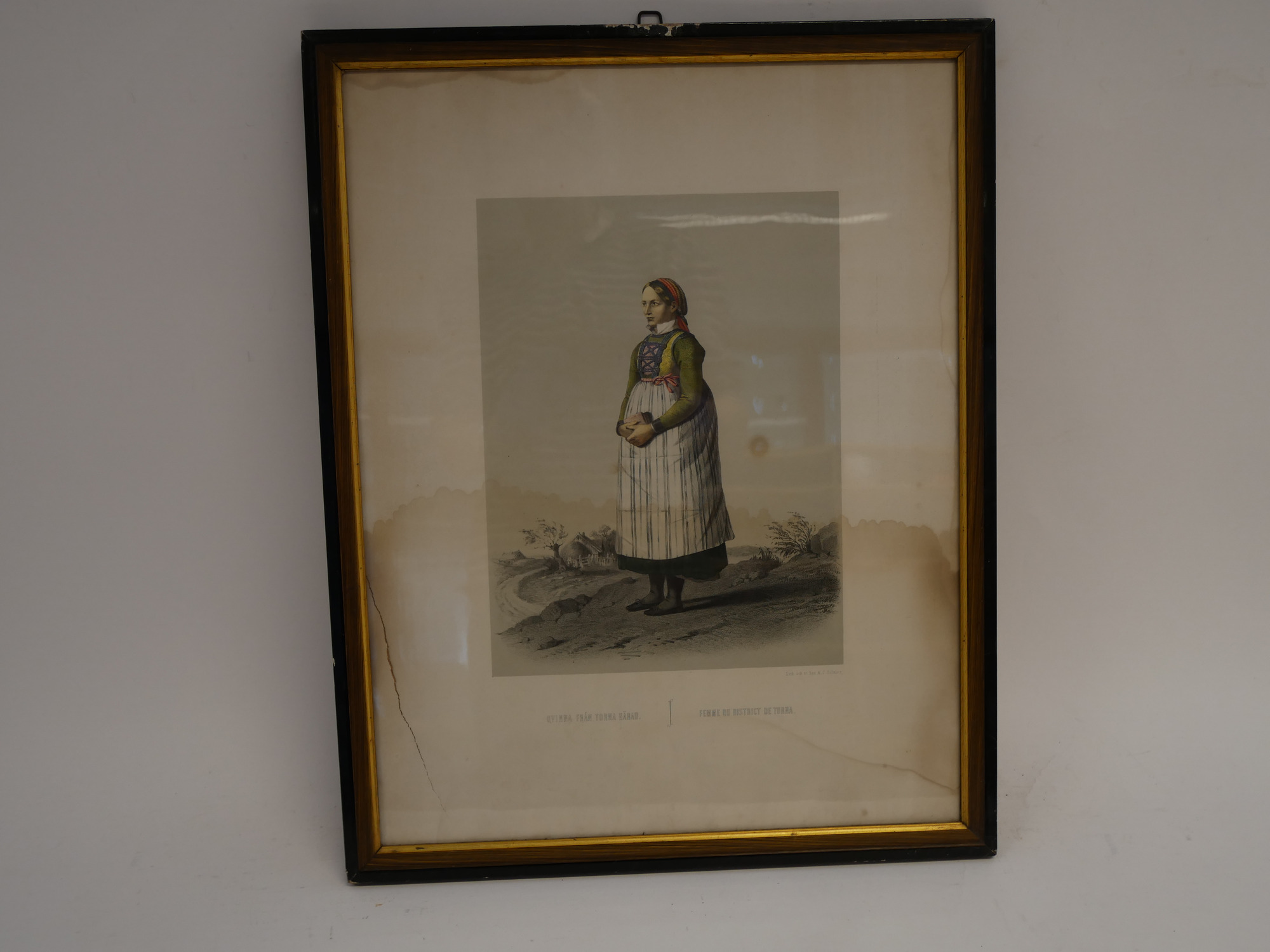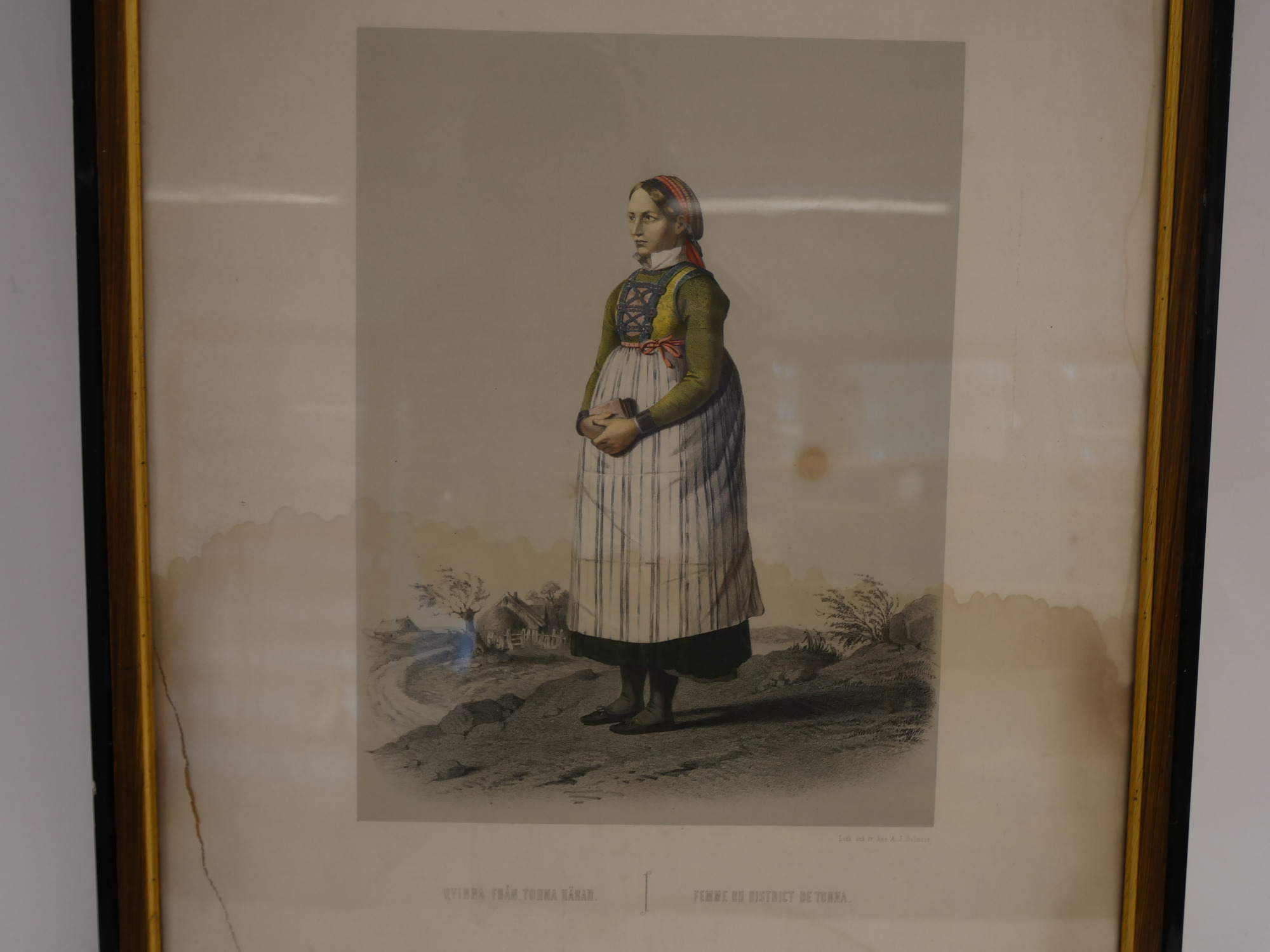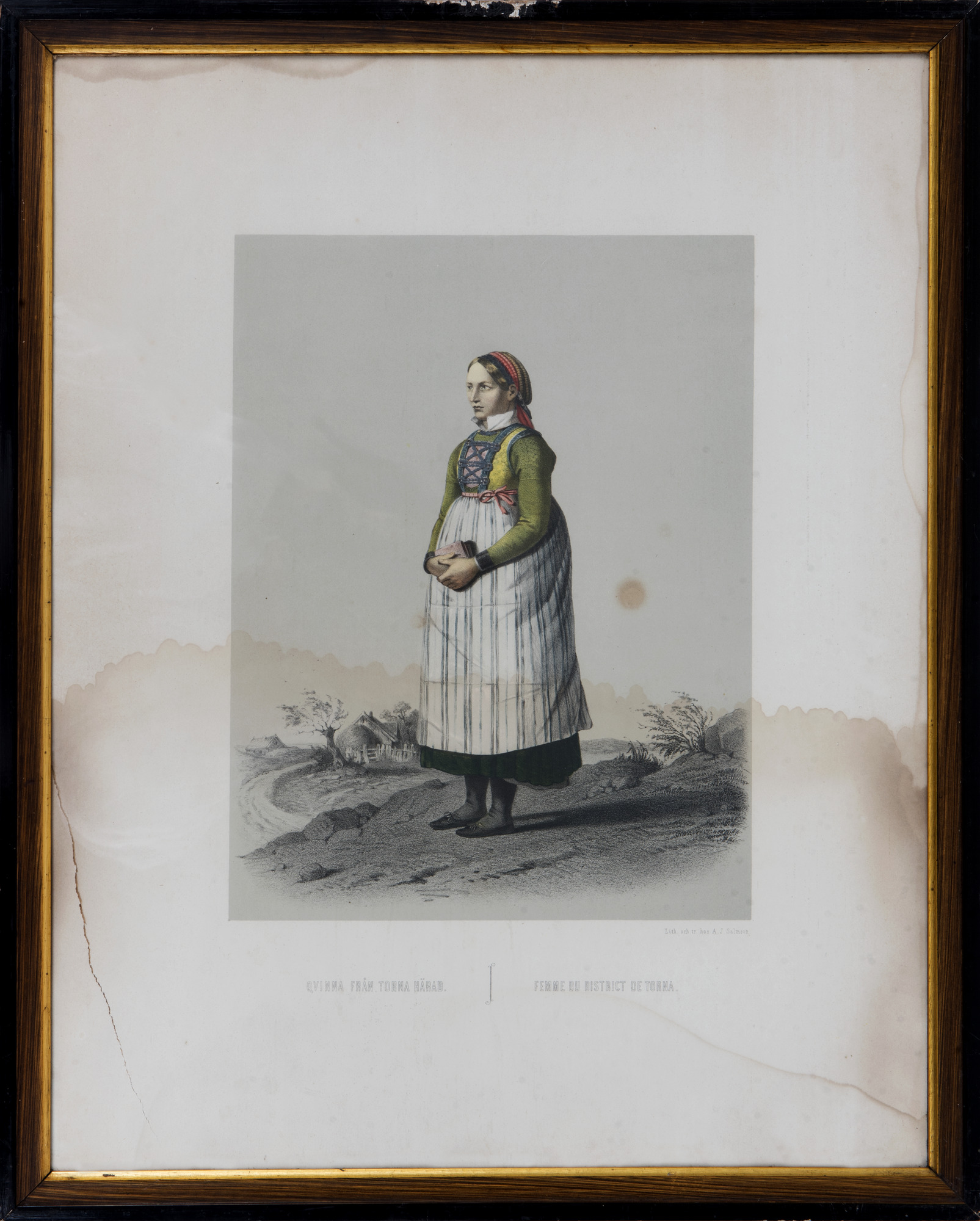 Litografi av skånsk häradsdräkt. Specifikt kvinna från Torna Härad. Avbildad framifrån