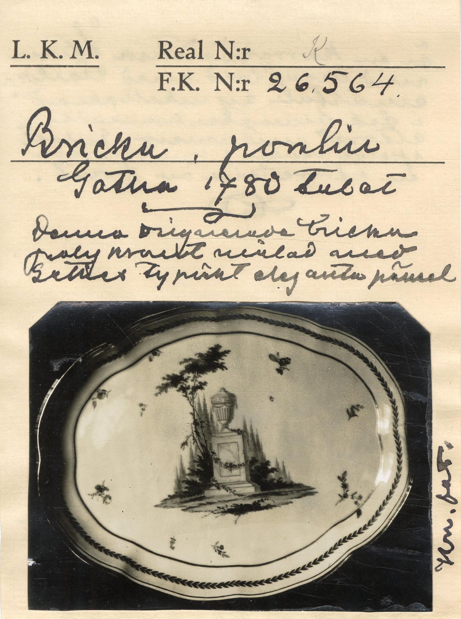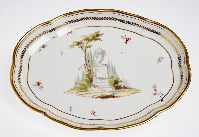 Oval, svagt vågig uppstående kant. Polykrom målad dekor, centrummotiv med urna på kolonnbas i landskap, omgivet av strödda blomkvistar samt stiliserad bladbård under kantränder i guld.